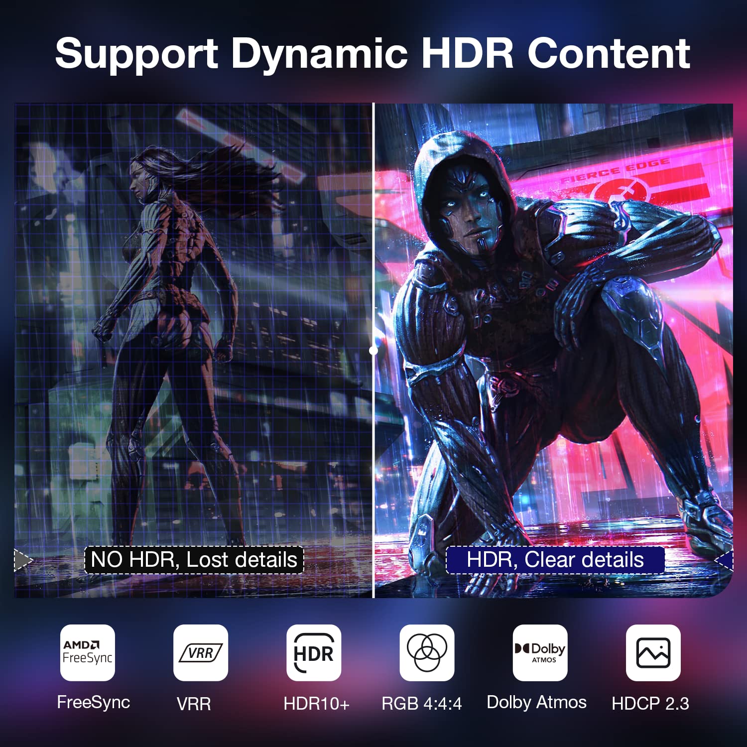 - Ultimate 8K@60Hz High Definition The uni-directional DP to HDMI adapter can delivers Ultra HD 8K (7680x4320) video at a high 60Hz refresh rate, this is an unprecedented breakthrough, backward compatible with 4K@120Hz, 2K@240Hz/165Hz/144Hz, 1080P@240Hz. And support for 32.4 Gbps bandwidth (HBR3), HDR, VRR, Dolby 7.1, HDCP 2.2, DSC 1.2a, 32 audio channels and FreeSync, allowing you to enjoy a smooth and tear-free immersive experience. Friendly Tip: Currently the VRR function only supports AMD RX