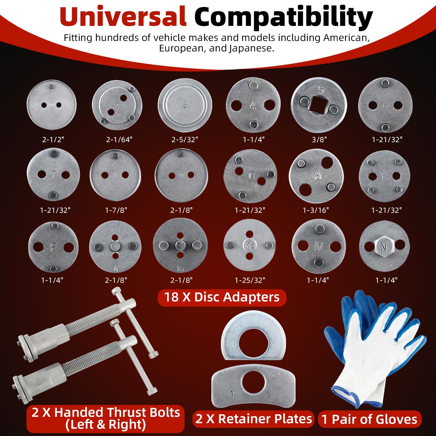 - 24Pc kits rotates piston back into caliper for fitting of new brake shoes and pads