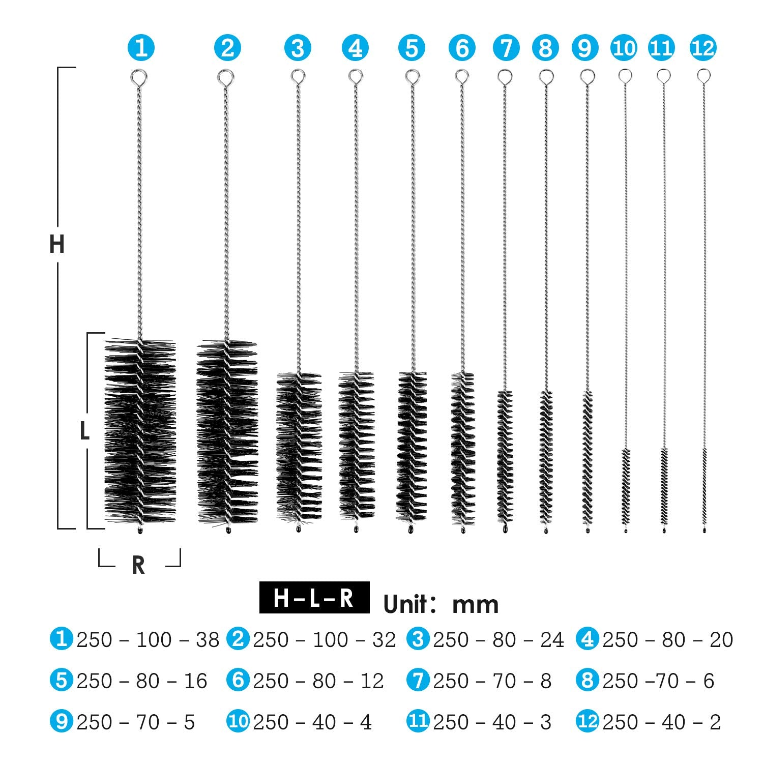 - MULTIPLE SIZES: Length 25cm(9.8 inches), Set of 12 Nylon Brushes with varying diameters. The diameters for these 12 brushes are 2, 3, 4, 5, 6, 8, 12, 16, 20, 24, 32 and 38mm. They are suitable for bottle, teapot, airbrushes, espresso machines etc, which can meet most needs of household cleaning. With this cleaning brushes in multiple sizes, you can always find a fit tool to clean gaps, dead angle places.