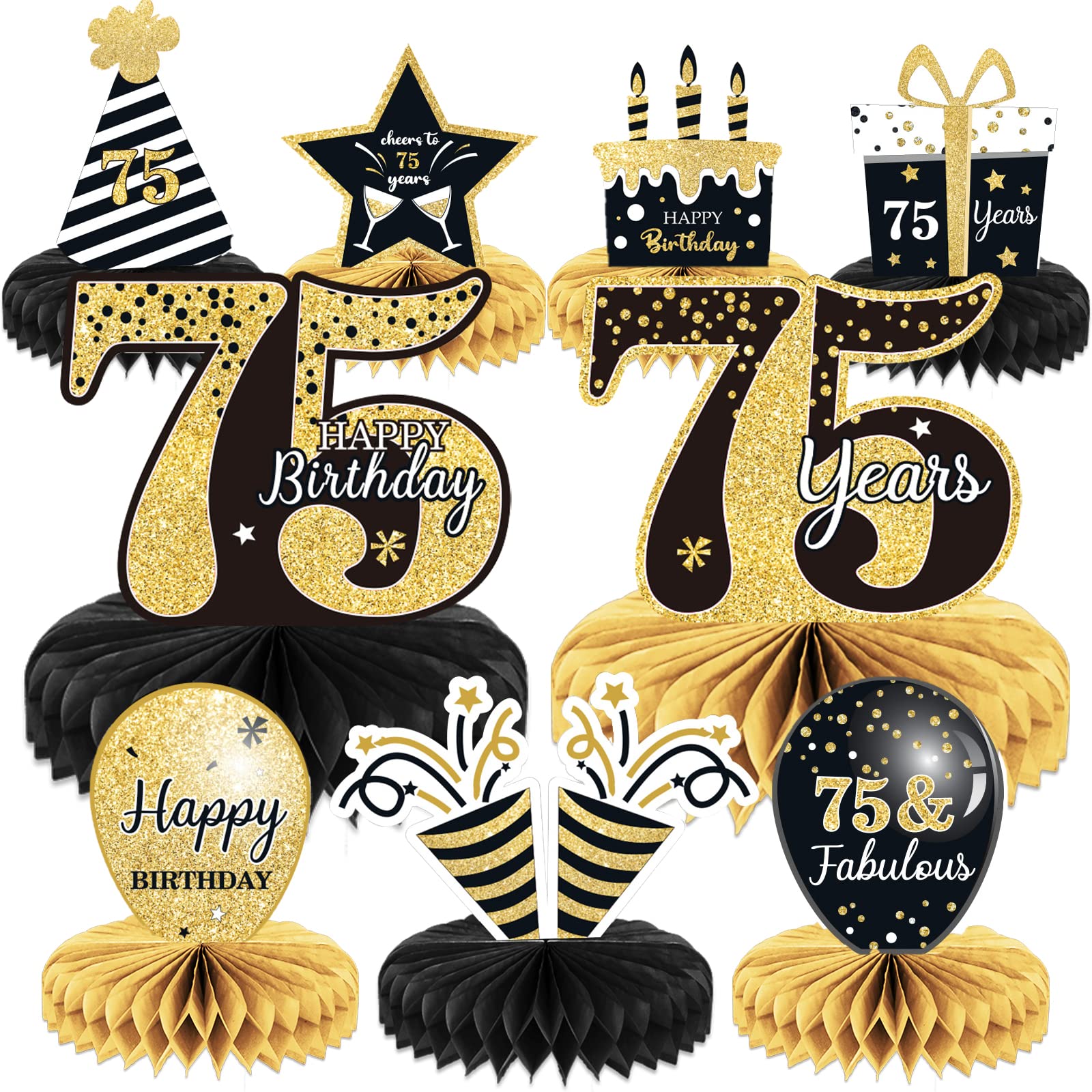 - Great 75th birthday party supplies: these cheers to 75 years table centerpieces exquisitely designed with interesting birthday elements so that everyone will love these chic designs. Decorating your home and party with our honeycomb centerpieces will be a big hit at your party.