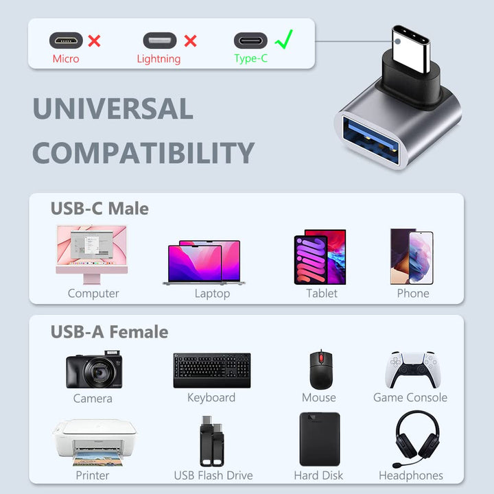 - WIDE COMPATIBILITY:This type-c adapter transforms USB-C port into a USB port to connect any standard USB device like USB cable, external hard drive, card reader, mouse, keyboard, webcam, camera, printer, game controller, midi keyboard to your PC, laptop, tablet or smartphone with USB C (Thunderbolt 3/4) port, like Macbook Pro 2021/2020/2019/2018/2017/2016, MackBook Air 2021/2020/2019/2018, iPad Pro 2021/2020/2018, iPad Air 5/4, Dell XPS 17/15/13, Surface Go, Samsung S22/Note 20 etc