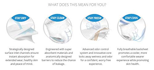 - Double absorbent core-ultra absorbent core transfers wetness and moisture quickly away from the skin ensuring the feeling of dryness. Odor protection-two premium super absorbing polymers lock odor away