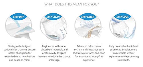 - Double absorbent core-ultra absorbent core transfers wetness and moisture quickly away from the skin ensuring the feeling of dryness. Odor protection-two premium super absorbing polymers lock odor away