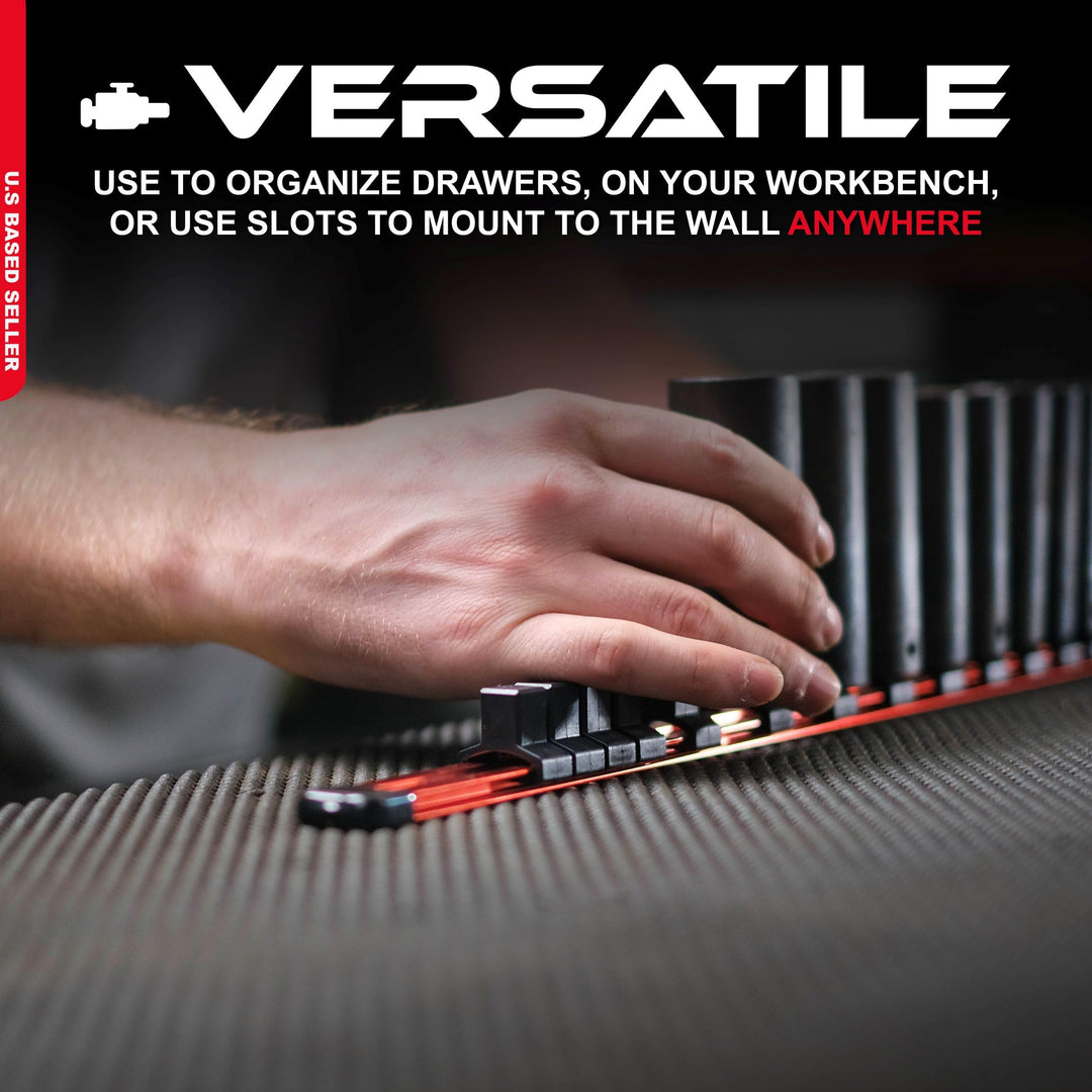 - USE ANYWHERE: Use the 17-inch x 0.82-inch (43cm x 2cm) rail as a toolbox drawer organizer to clean up your toolbox, wall socket organizer as you mount on a wall vertically or horizontally, socket tray as you set it on your workbench, or tool drawer organizer as you store it in a drawer; 1-inch x 0.2-inch (25mm x 5mm) keyhole slots to mount on any surface (hardware not included); SAE standard 1/2-inch socket drive