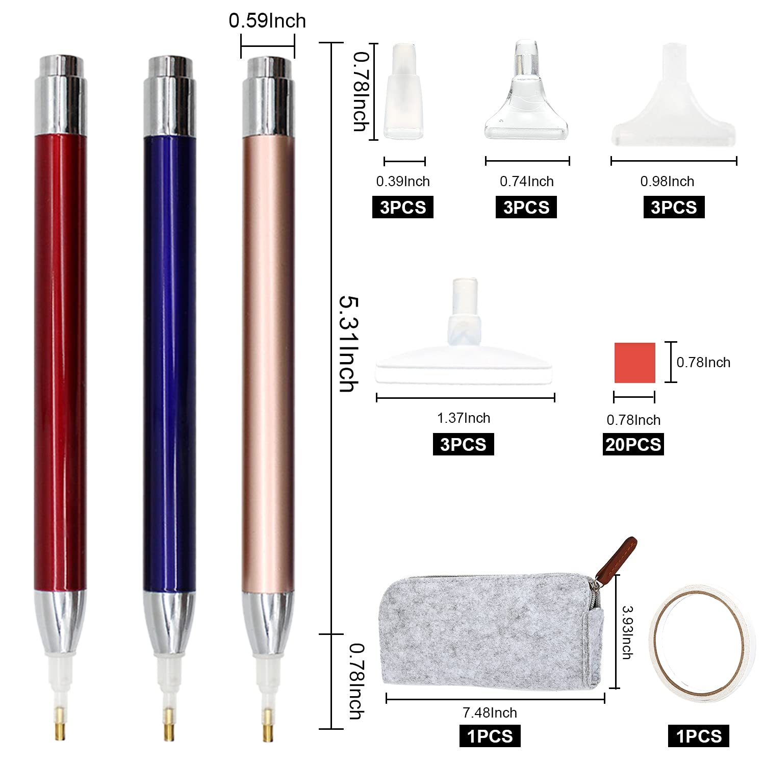 - Functional Diamond Painting KitsThe diamond painting tools include 3 pack different-color diamond painting pen(without batteries), 1 pack storage bag, 1 pack tape, 20 pieces of glue clay, 12 pieces of multi-point tips including 3-drill, 6-drill, 9-drill, 12-drill pen head (three for each type). The diamond art accessories and tools are easy to use and can help you complete diamond painting arts with more efficiency.