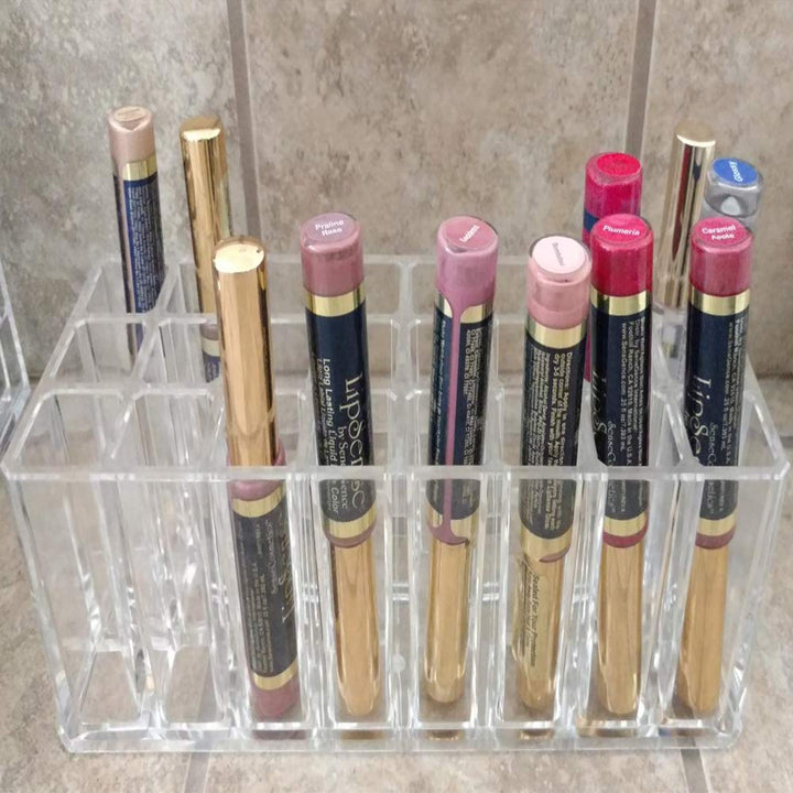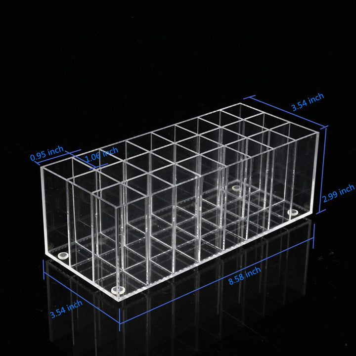 - LARGE SIZE: IT is stylish clear transparent comes with 24 slots design, The size is 8.58 inches x 3.54 inches x 2.99inches, the slot size is 0.95 inches x 1.06 inches, which large enough to organize your daily lipsticks and lip gloss and save spaces.