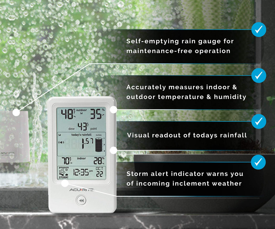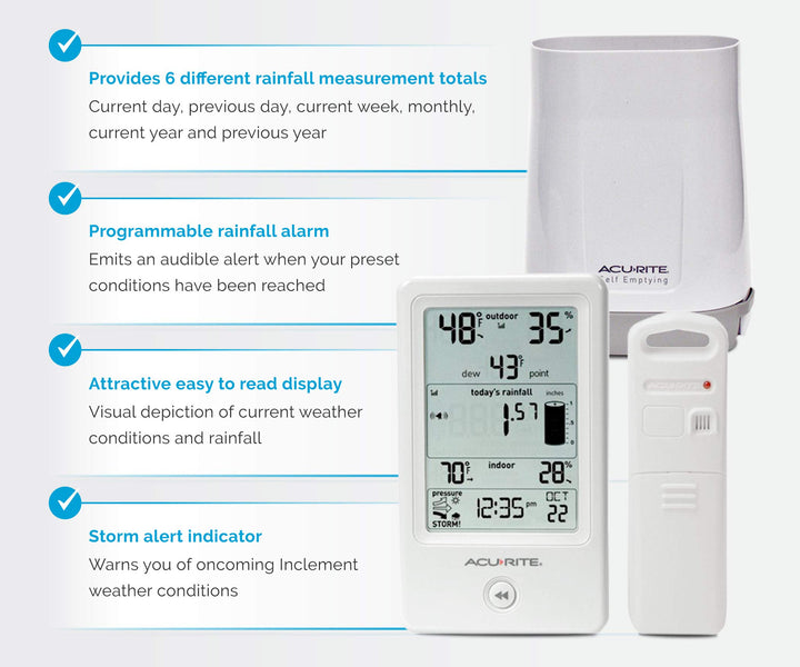 - Self-emptying rain collector measures rainfall in your backyard and wirelessly transmits readings to an indoor digital display (100-foot; 30 meter range)