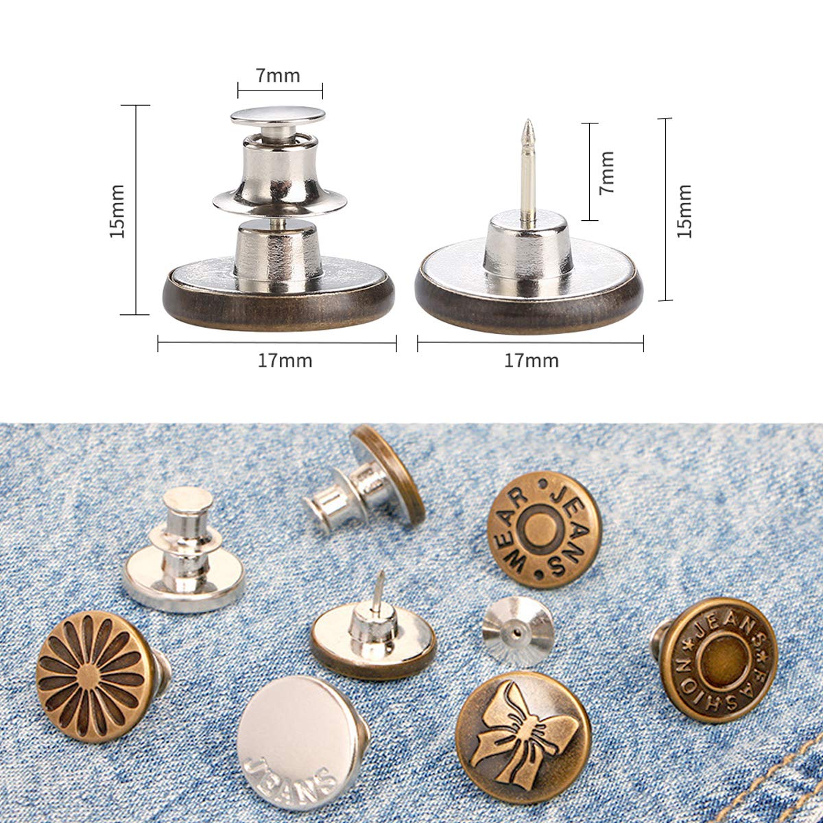 - Unique Design - Tool free, No-sewing, Removable and Reusable ,Our Instant Jean Button Pins will give you extra 1 space, or reduce by 1 size of your waist when it's too loose INSTANTLY ,Also Easy apply them on jeans, shorts, jackets, suspenders, suits, trousers, coats, shirts, overalls and more,Buttons Pins can also be used as brooches and decorations on clothes.