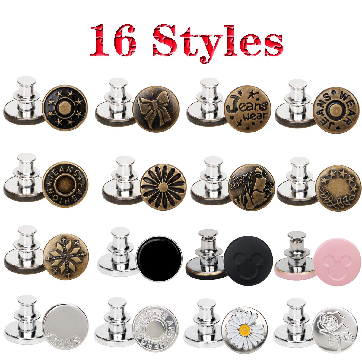 - Package - 16 Sets Different Styles Fashion Jean Buttons are put in a plastic boxes, easy to store and also easy to find for next time use. What You Get: Total 16 sets buttons (16 styles).you could have more choice