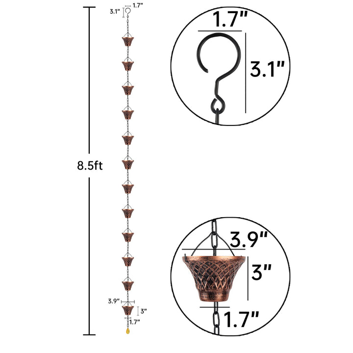 - Perfect Size: Our rain chains for outside measure 8.5 feet long, with each cup 3.9 inches in diameter at the top, 1.7 inches in diameter at the bottom, and 3 inches high. The narrow drain design reduces the noise of rain splashing, making it perfect for any home.