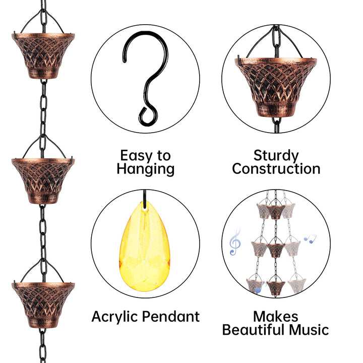 - Enhance Your Home's Aesthetics: Our rain chain is a beautiful and functional alternative to traditional gutter systems. It features 12 exquisite copper gird shape cups and a gorgeous acrylic pendant that will add a touch of elegance to your home.