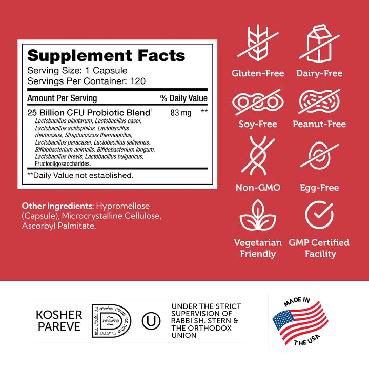 - 25 BILLION CFU FOR FLEXIBLE DOSING - Take control of your gut health with our probiotic nutritional supplements. With 25 billion CFUs per serving, these probiotic capsules let you increase your dosage up to 4 servings a day. After opening, refrigerate to maintain potency.