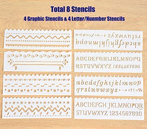 4 graphic stencils & 4 letter / number stencils, helps etch different typs of words, numbers and graphics