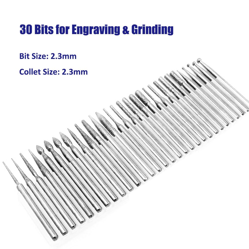 - Total 30 Bits & 8 StencilsIncludes 2 Collets (2.3mm), 10 pointed bits, 5 round bits, 4 jujube-shaped bits, 11 flat bits; 4 graphic stencils, and 4 letter / number stencils.