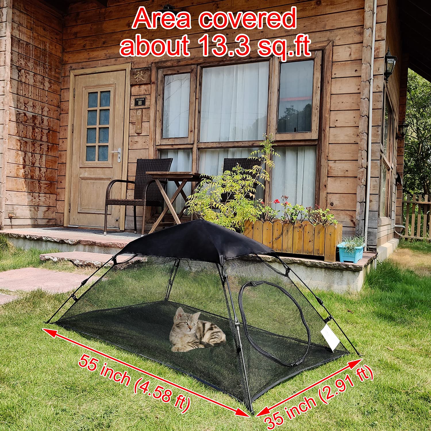 - ALLOWS INDOOR PETS TO SAFELY ENJOY A DAY IN THE SUN - Perfect for everyday use on your lawn, balcony, and more. Allows cats and other small pets to safely enjoy a day in the sun with a 360-degree view. We recommend testing the play tent indoors prior to outdoor use.Dimensions: 55 inch (length) x 35 inch (width) . The diameter of the opening with the zipper is about 17.7 inch, suitable for most animals to enter the tent.