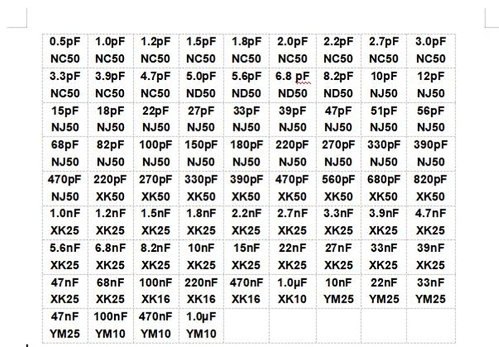Containing all the values from 0.5pF to 10uF including NPO, X7R and Y5V;
