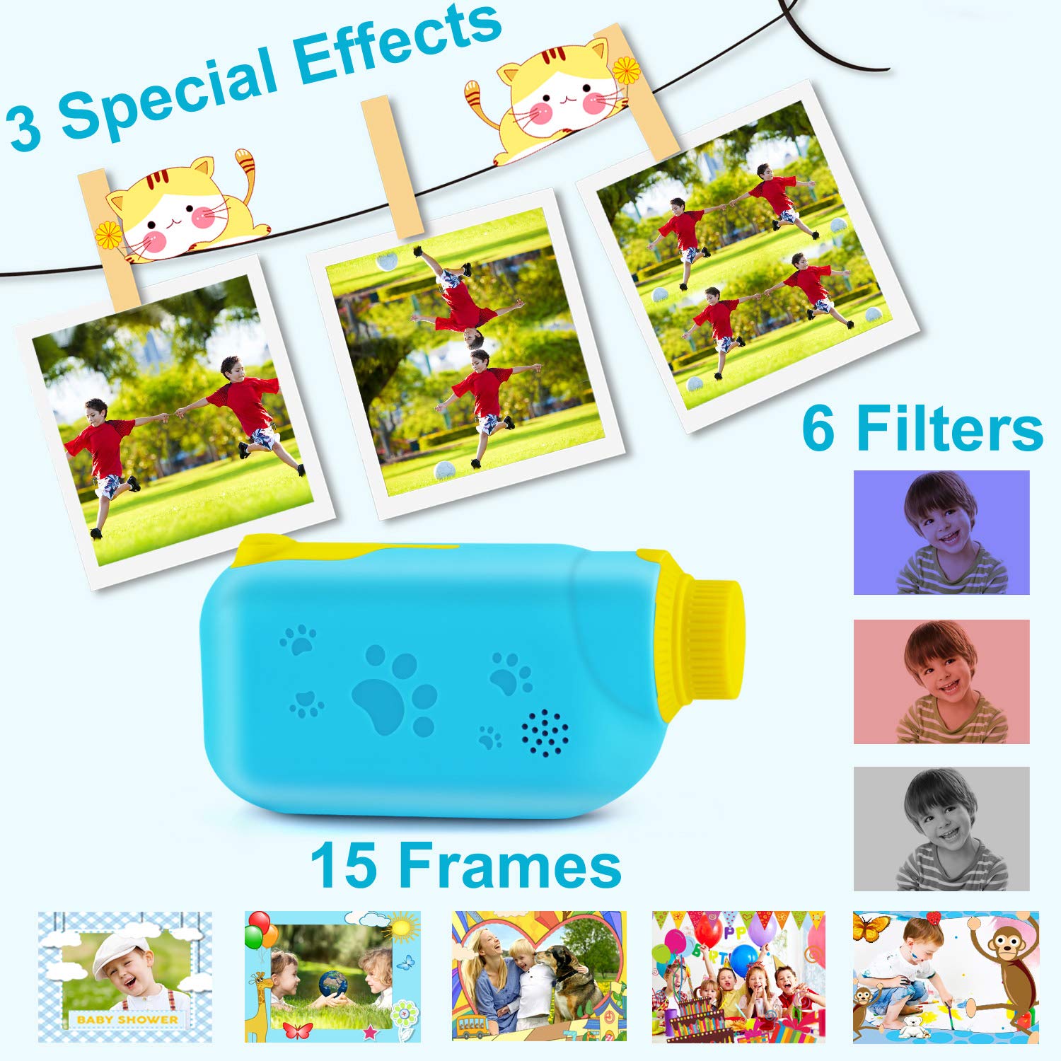 - Multi-function Camera for Kids:Comes with 15 lovely frames, 6 different filters and 3 pranking special effects, 5 puzzle game. The prankster boys and girls can choose their preferable frames or special effects with this toddler camera, capture the moments in the nature and enjoy photography with their own ideas.