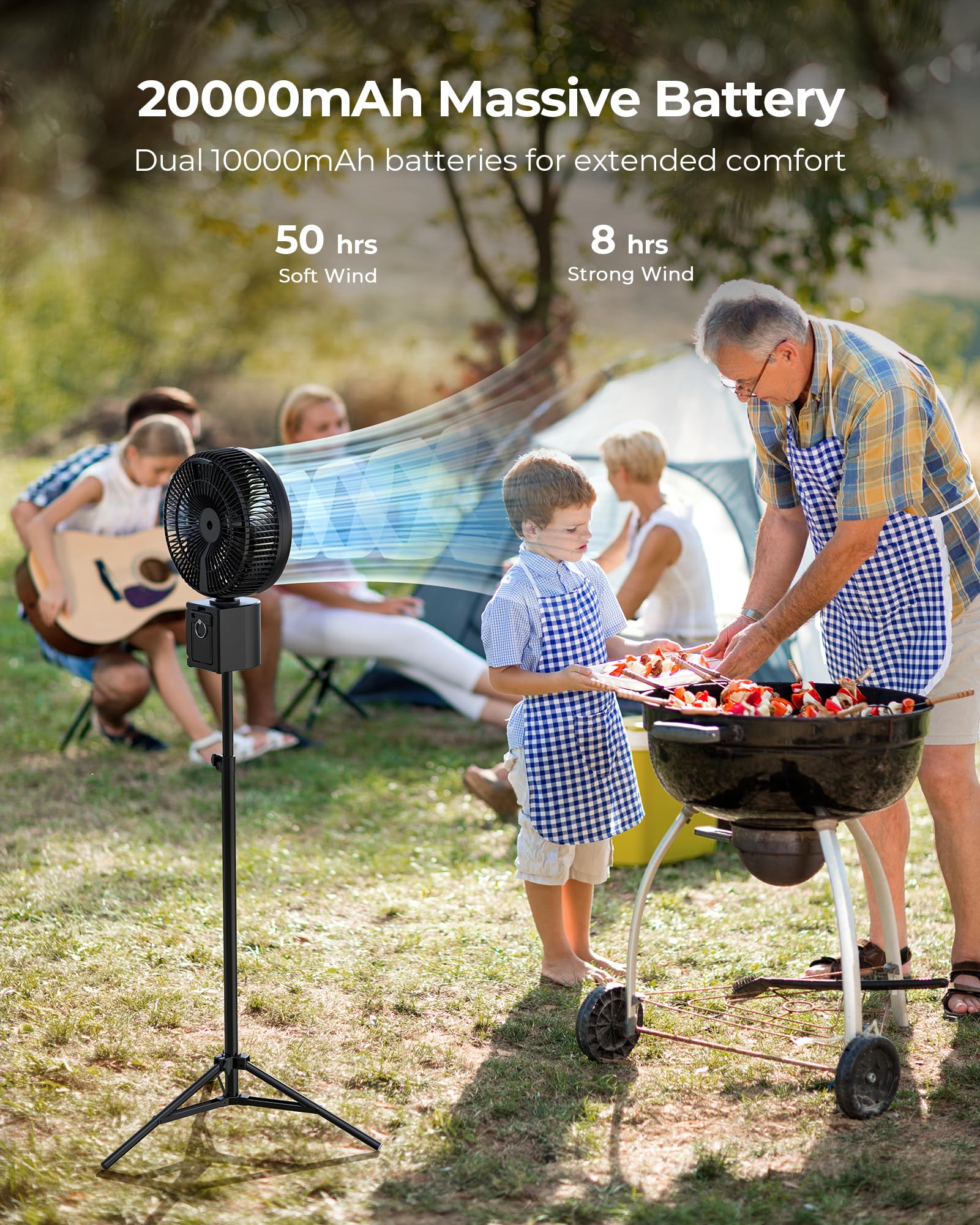 - Impressive Battery Life: Equipped with 2*10000mAh rechargeable batteries, the portable pedestal fan deliver up to 50 hours after a full charge. You can also use the fan’s backup battery to charge the phone or other devices in an emergency.