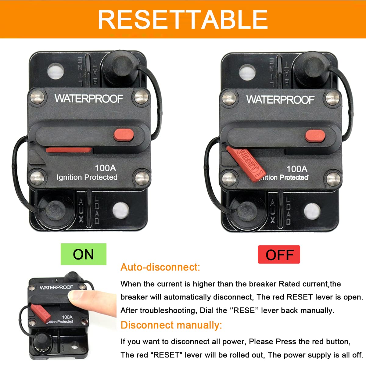 - Original Circuit Breaker – 100 Amp Circuit Breaker with Manual Reset Fuse for Car Marine Trolling Motors Boat ATV Manual Power Protect for Audio System Fuse DC 12V-48V Waterproof (100A),74 x 49 x 44 by AISHDE