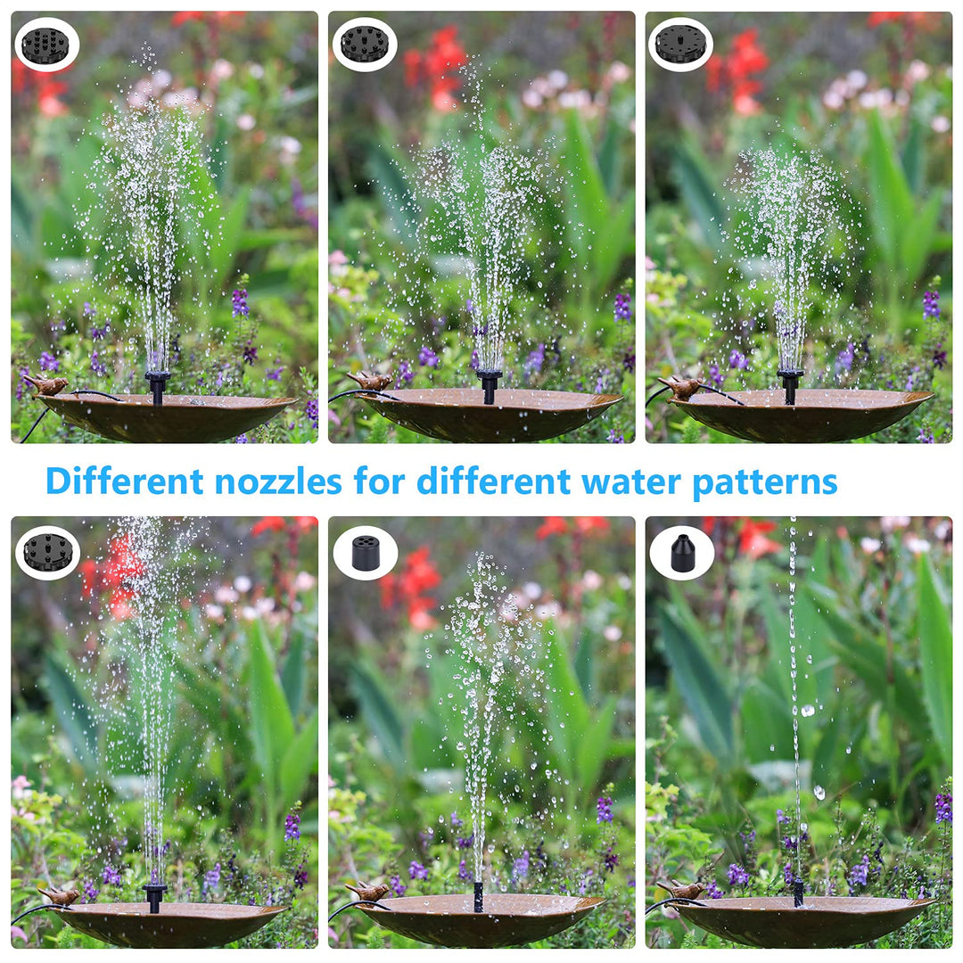 - [DIY Solar Water Pump Kit]: This small solar water fountain can be used for many kinds of DIY to add fun to your garden. Can be made into a solar bird bath fountain pump and fish tank water circulation tools. Keep up a safe, fresh and healthy bathing environment for fish and birds.Replace the nozzles with water pipes to make different water feature that will make your garden look comfortable and inviting.