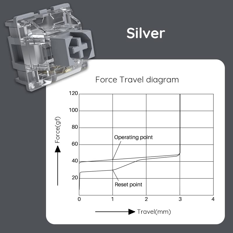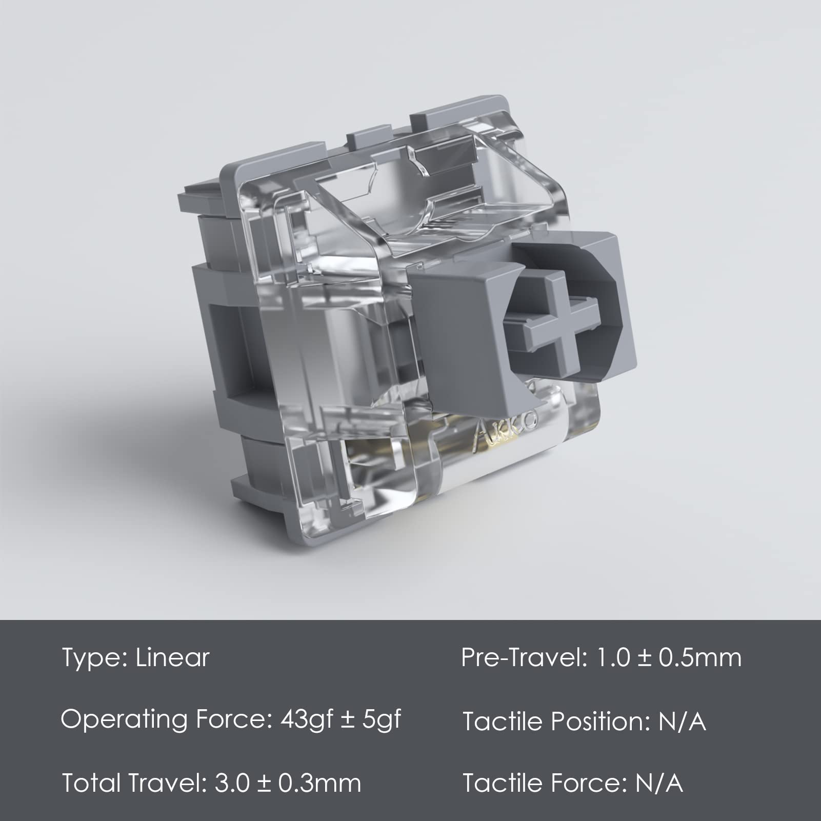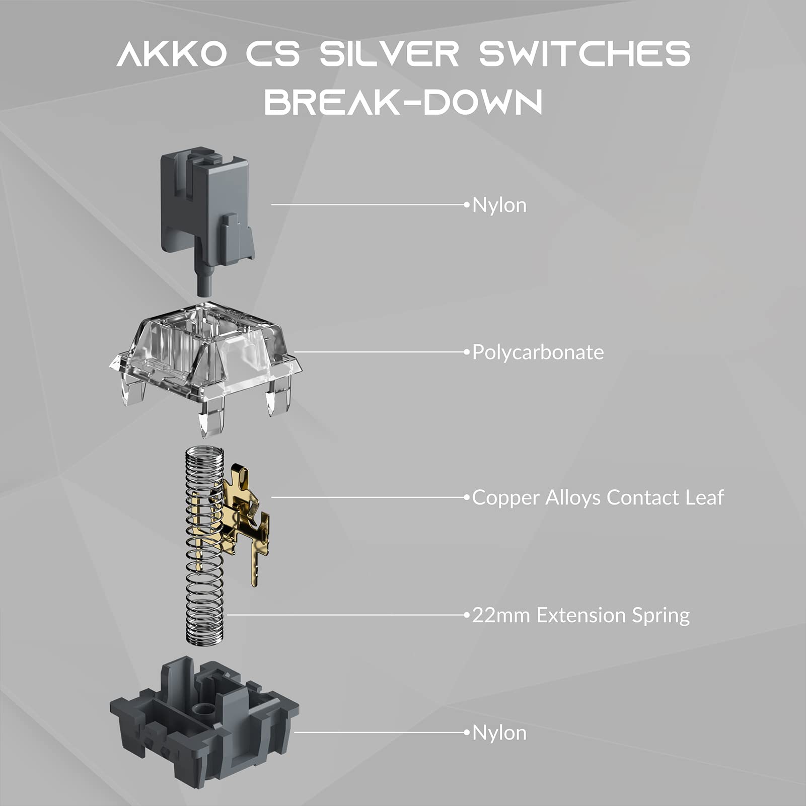 - Silver 43gf Linear Switch – Akko Silver is equipped with dustproof stem for enhanced stability. With short pre-travel of 1mm, this is one of the fastest Akko CS switches and is ideal for gaming.