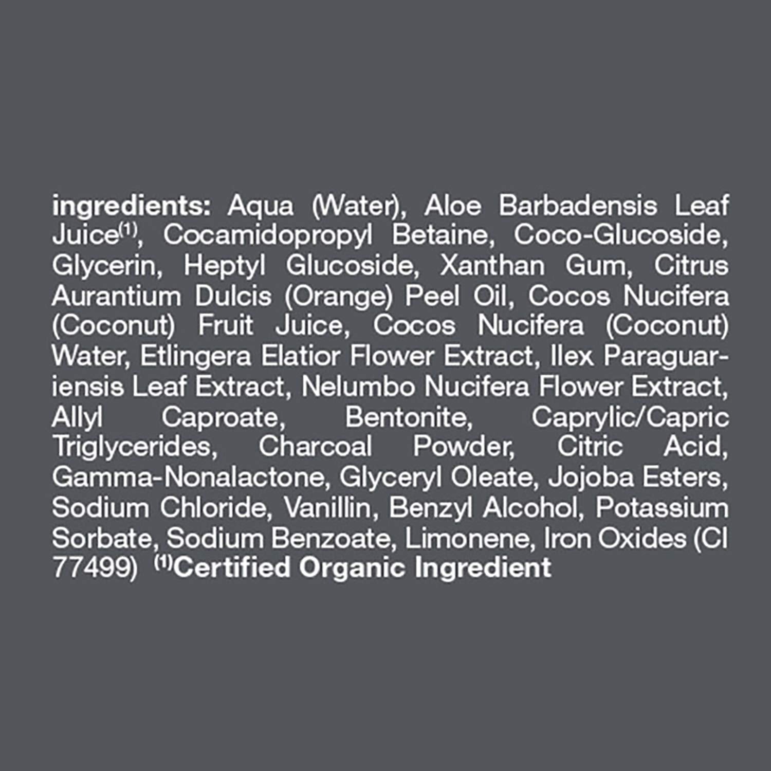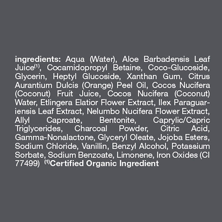 | ingredients | Water (Aqua), Aloe Barbadensis Leaf Juice (Certified Organic Ingredient), Cocamidopropyl Betaine, Coco-Glucoside, Glycerin, Heptyl Glucoside, Xanthan Gum, Citrus Aurantium Dulcis (Orange) Peel Oil, Cocos Nucifera (Coconut) Fruit Juice, Cocos Nucifera (Coconut) Water, Etlingera Elatior Flower Extract, Ilex Paraguariensis Leaf Extract, Nelumbo Nucifera Flower Extract, Allyl Caproate, Bentonite, Caprylic/Capric Triglycerides, Charcoal Powder, Citric Acid, Gamma-Nonalactone, Glyceryl Oleate, Jojoba Esters, Sodium Chloride, Vanillin, Benzyl Alcohol, Potassium Sorbate, Sodium Benzoate, Limonene, Iron Oxides (CI 77499). Water (Aqua), Aloe Barbadensis Leaf Juice(1), Cocamidopropyl Betaine, Coco-Glucoside, Glycerin, Heptyl Glucoside, Xanthan Gum, Citrus Aurantium Dulcis (Orange) Peel Oil, Cocos Nucifera (Coconut) Fruit Juice, Cocos Nucifera (Coconut) Water, Etlingera Elatior Flower Extract, Ilex Paraguariensis Leaf Extract, Nelumbo Nucifera Flower Extract, Allyl Caproate, Bentonite, Caprylic/Capric Triglycerides, Charcoal Powder, Citric Acid, Gamma-Nonalactone, Glyceryl Oleate, Jojoba Esters, Sodium Chloride, Vanillin, Benzyl Alcohol, Potassium Sorbate, Sodium Benzoate, Limonene, Iron Oxides (Cl 77499). (1)Certified organic ingredient |