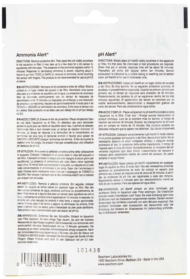 | directions | use the suction cup to hold the alert submerged to the side of the tank. Care No care is required beyond removing algae with a clean, soft material. Do not use bleach, soap, detergents or hard objects to clean the sensor. Some dye medications may discolor the sensor. For maximum sensitivity, the unit should be read under natural daylight or daylight simulating light. Replacing the Sensor Sensor exhaustion is indicated by a visible fading or washing out of sensor color. Once the sensor is exhausted, peel off adhesive backing of the included replacement sensor and apply to pH Alert®. Avoid touching the sensor with fingers, since skin oils can damage it. Tweezers are recommended if possible. |