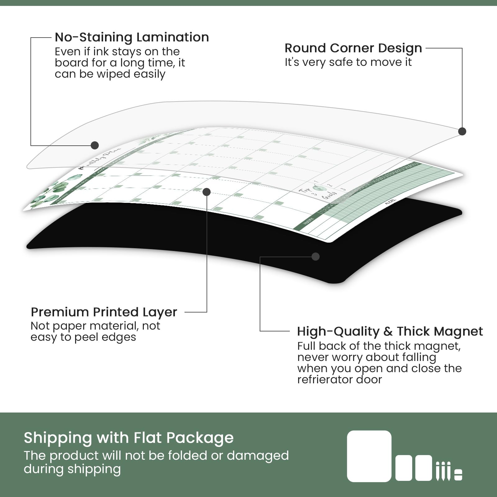 - Greenery Design: The design of the fridge calendar whiteboard adds green leaf elements. Leave the freshness at home! In addition, top 3 goals and habit track are added to the planner. Remind your goals of the month, and use habit tracker to develop good habits, it’s easy for you with the greenery fridge calendar.