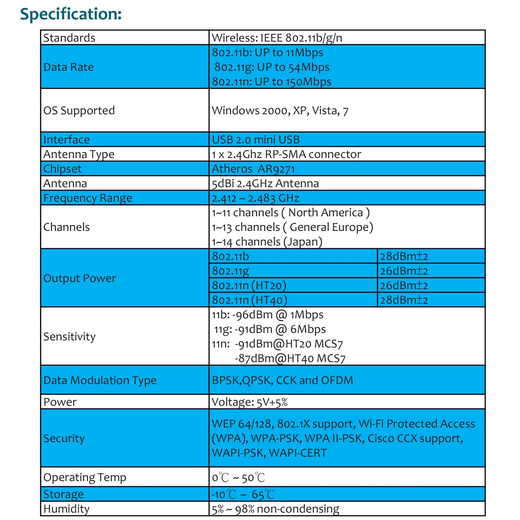 * Data Rate 802.11b: UP to 11Mbps / 802.11g: UP to 54Mbps / 802.11n: UP to 150Mbps