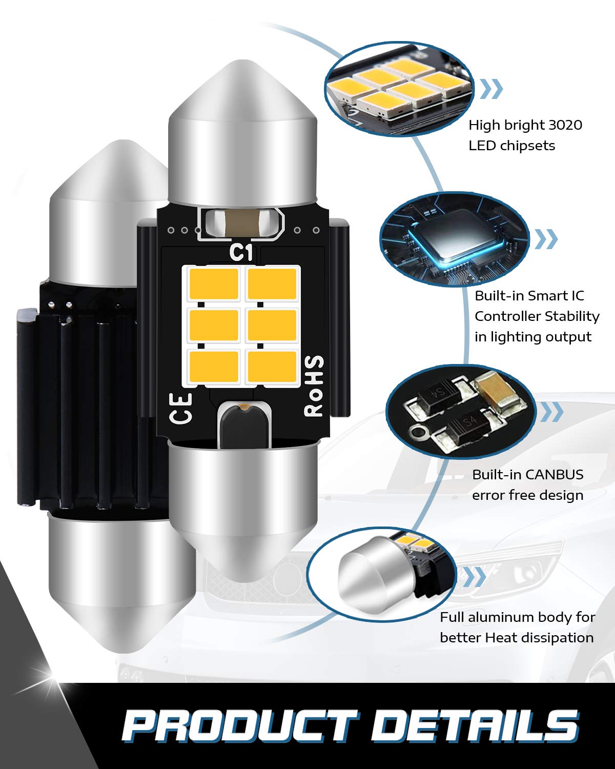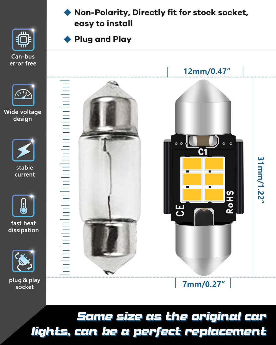 - 3 Times BrighterConsisting of 6pcs 3020 led high power chips, this festoon led bulbs can create a full lighting angle, no dark area. The brightness is 3 times more than the OEM bulb, however consume less power.