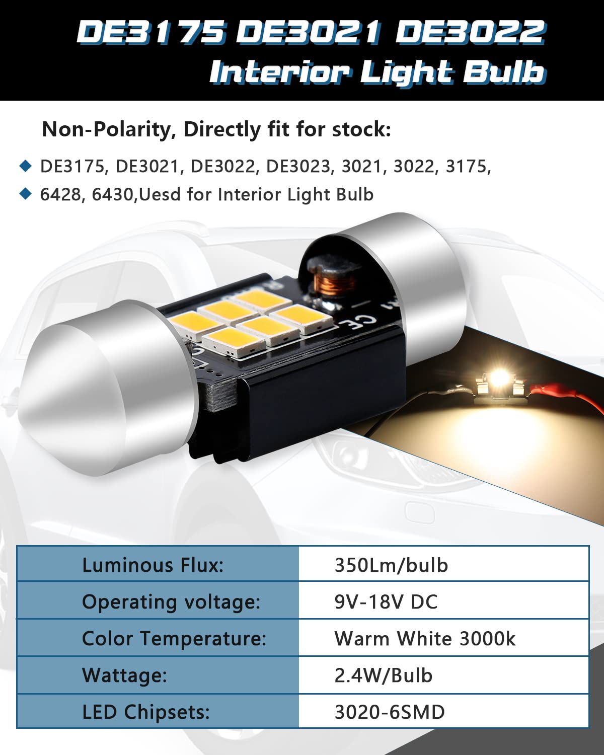 - Replaces Stock Bulb: The 1.25" (31mm) led light bulbs will fit 3021 3022 3175 6428 6430 DE3175 DE3021 DE3022 etc.