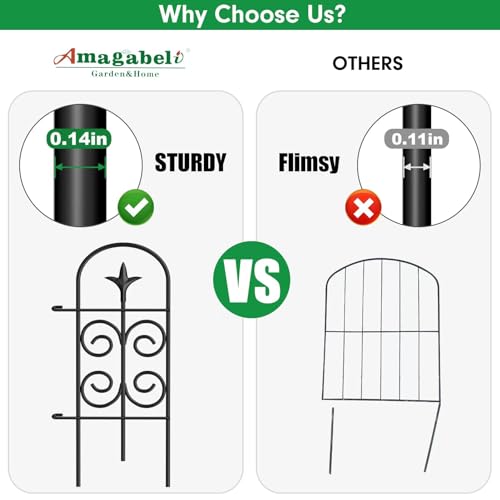 - RUSTPROOF & DECORATIVE:Our metal garden fences and borders for dogs made Of 0.14 inch thick wrought iron solid steel and high quality welded,so they are heavier and sturdier than other common fencing panels made of 0.11 inch flimsy soft iron wire or hollow tubes.Rustproof and Durable for outdoor using yard garden beds, garden fence border garden edging dog fences animal barrier.