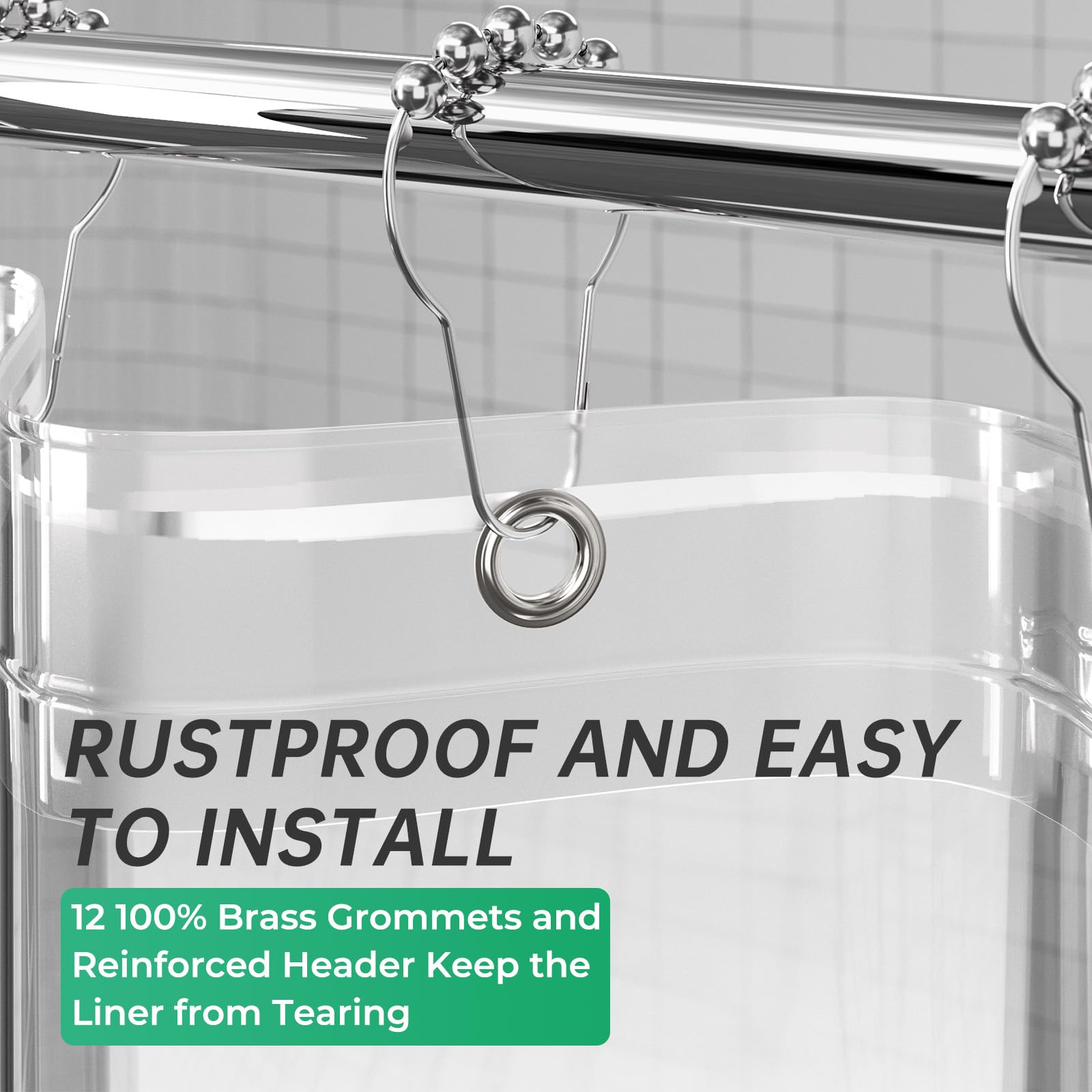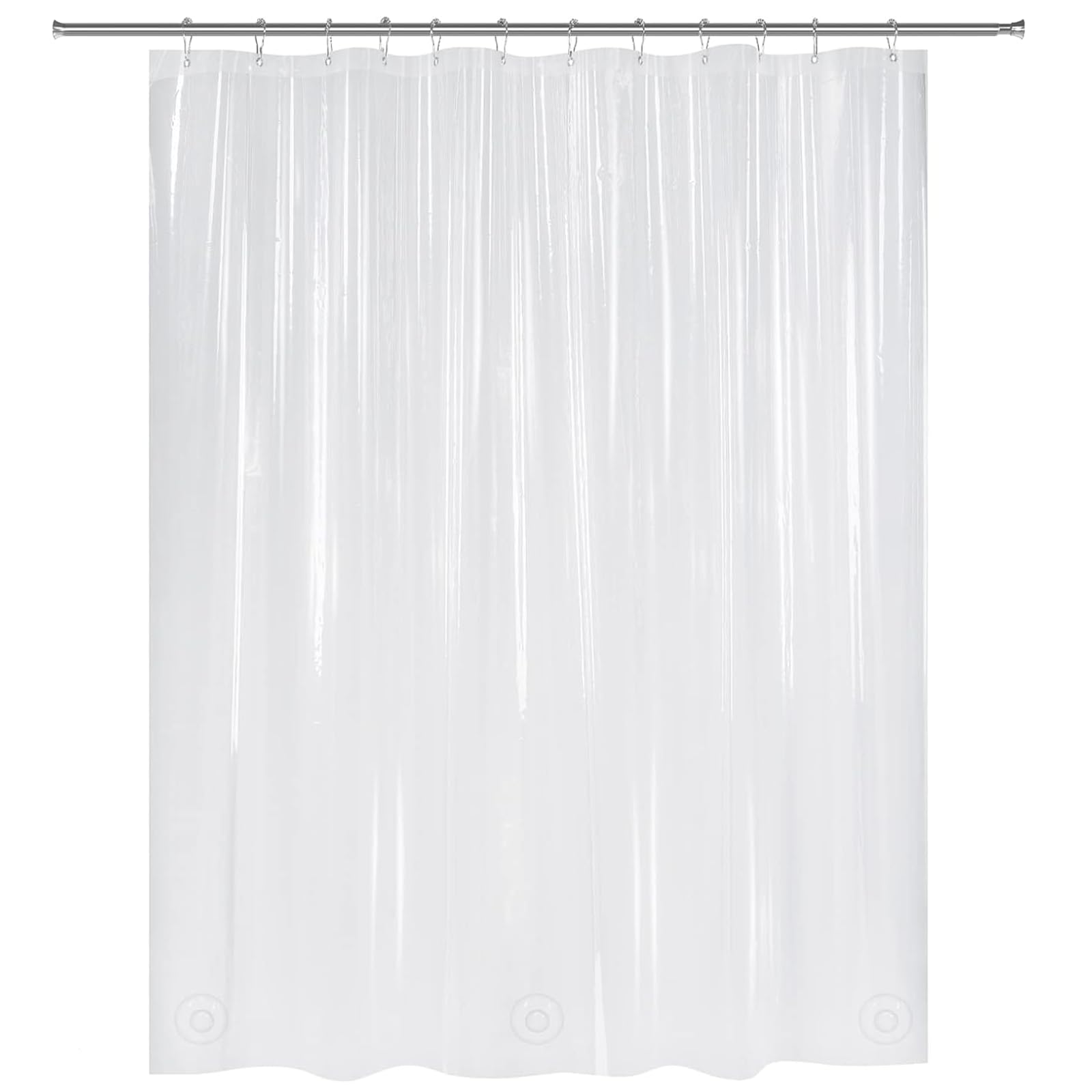 - Reliable heavy weight design - This weighted shower curtain liner is designed to last for a long time and keep from tearing. Each clear shower liner provides 12 rustproof metal grommet holes to accommodate standard or decorative shower curtain hooks. The metal grommet holes and reinforced header promote easier hanging and long-lasting strength.