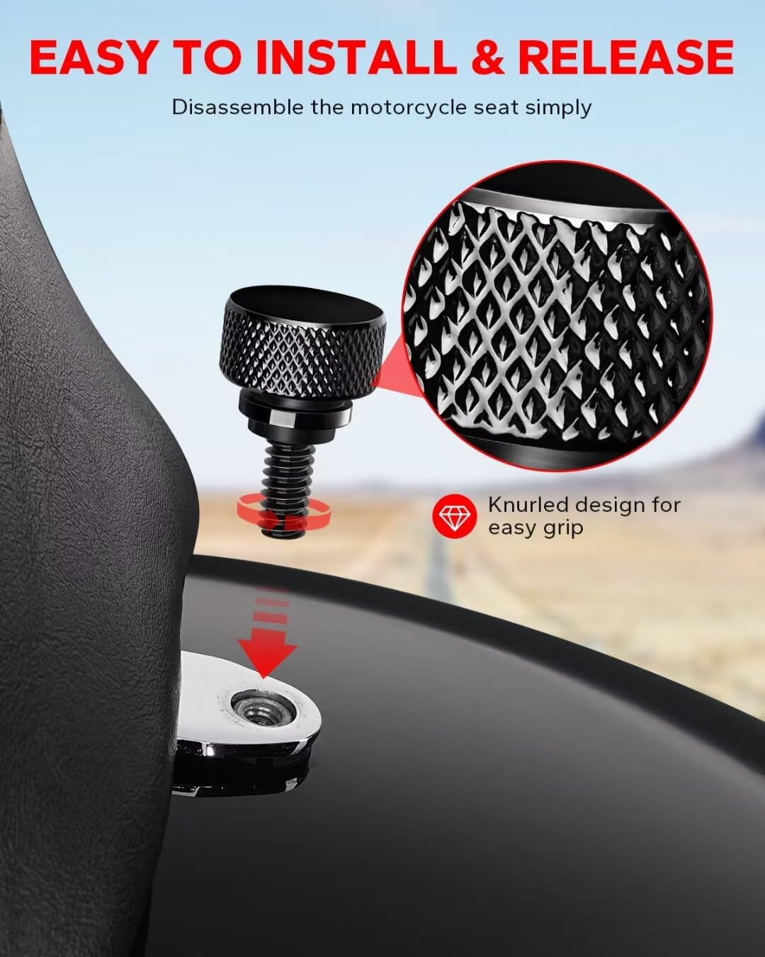 - Stylish Glossy Black FinishThe seat bolts features a diamond-like knurled design, adding a touch of exquisite to your motorcycle. With its sleek glossy black finish, perfectly matches with your motorcycle luster.