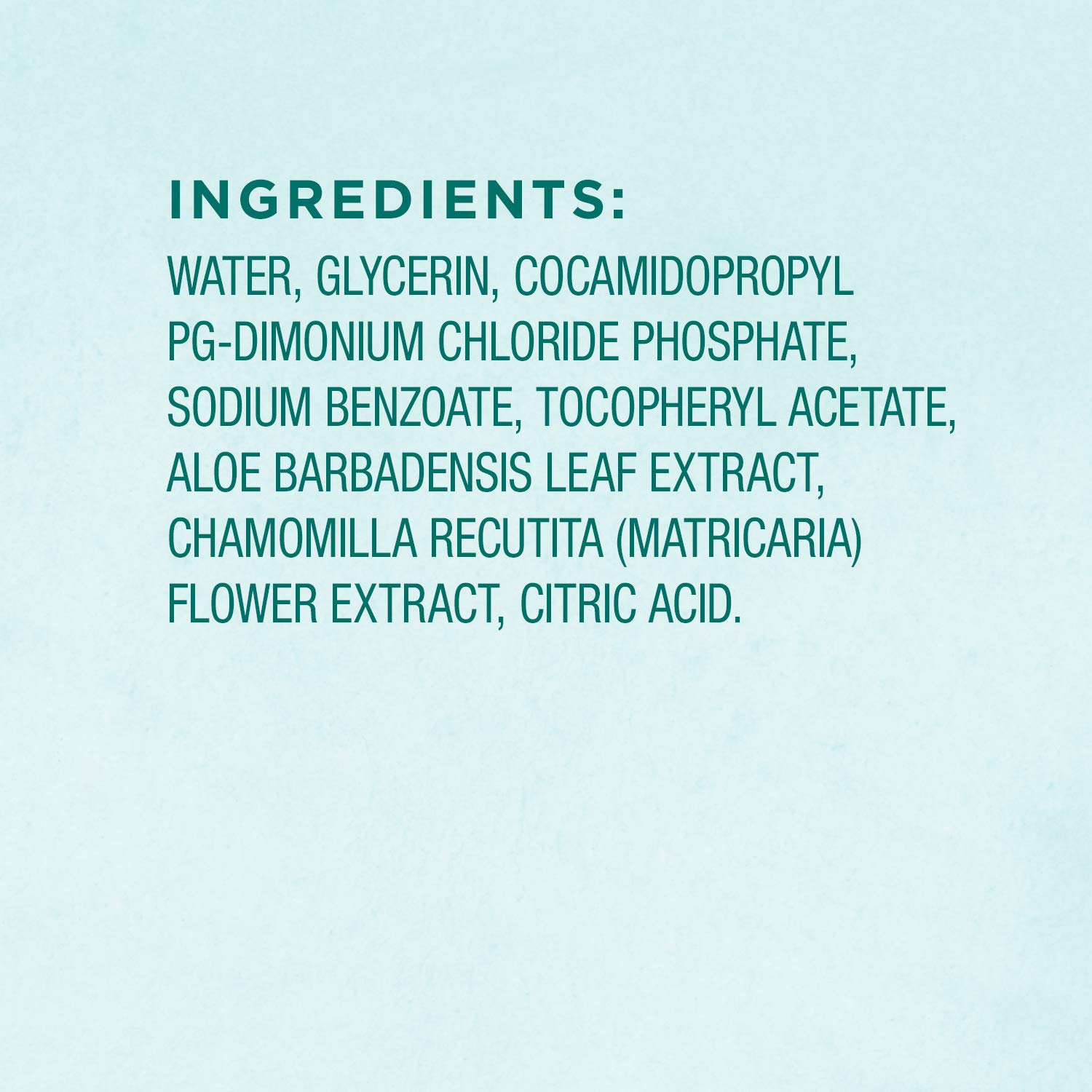 | ingredients | Water, Glycerin, Sodium Benzoate, Cocamidoprpyl PG-Dimonium Chloride Phosphate, Tocopheryl Acetate, Aloe Barbadensis Leaf Extract, Chamomilla Recutita Flower Extract, Citric Acid |