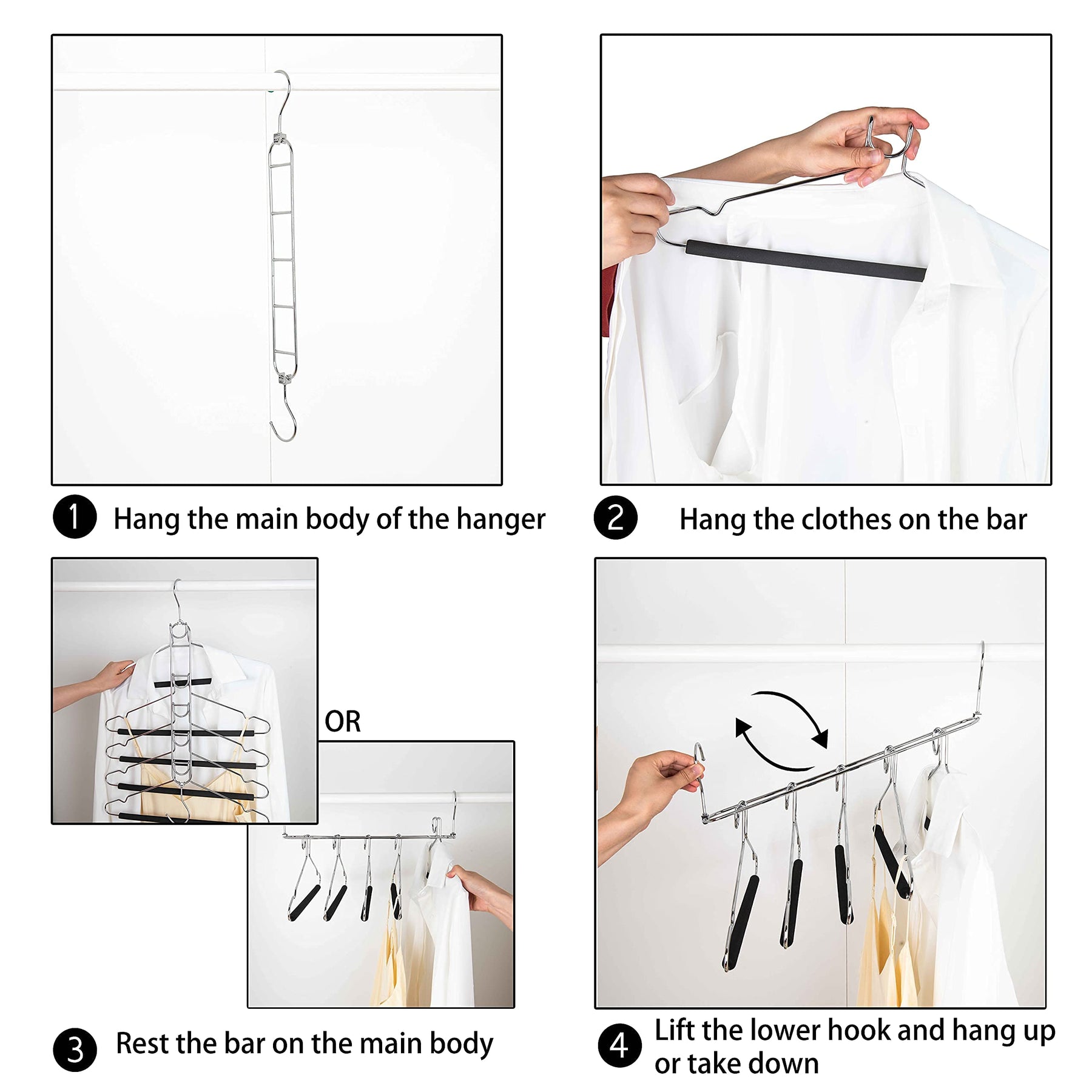 - 360° Swivel Hook & Non-slip Foamed Pants Bar360° swivel hook makes hanging, browsing, accessing clothes more easier. grippy foam coating on bottom to help avoid garments slipping off.