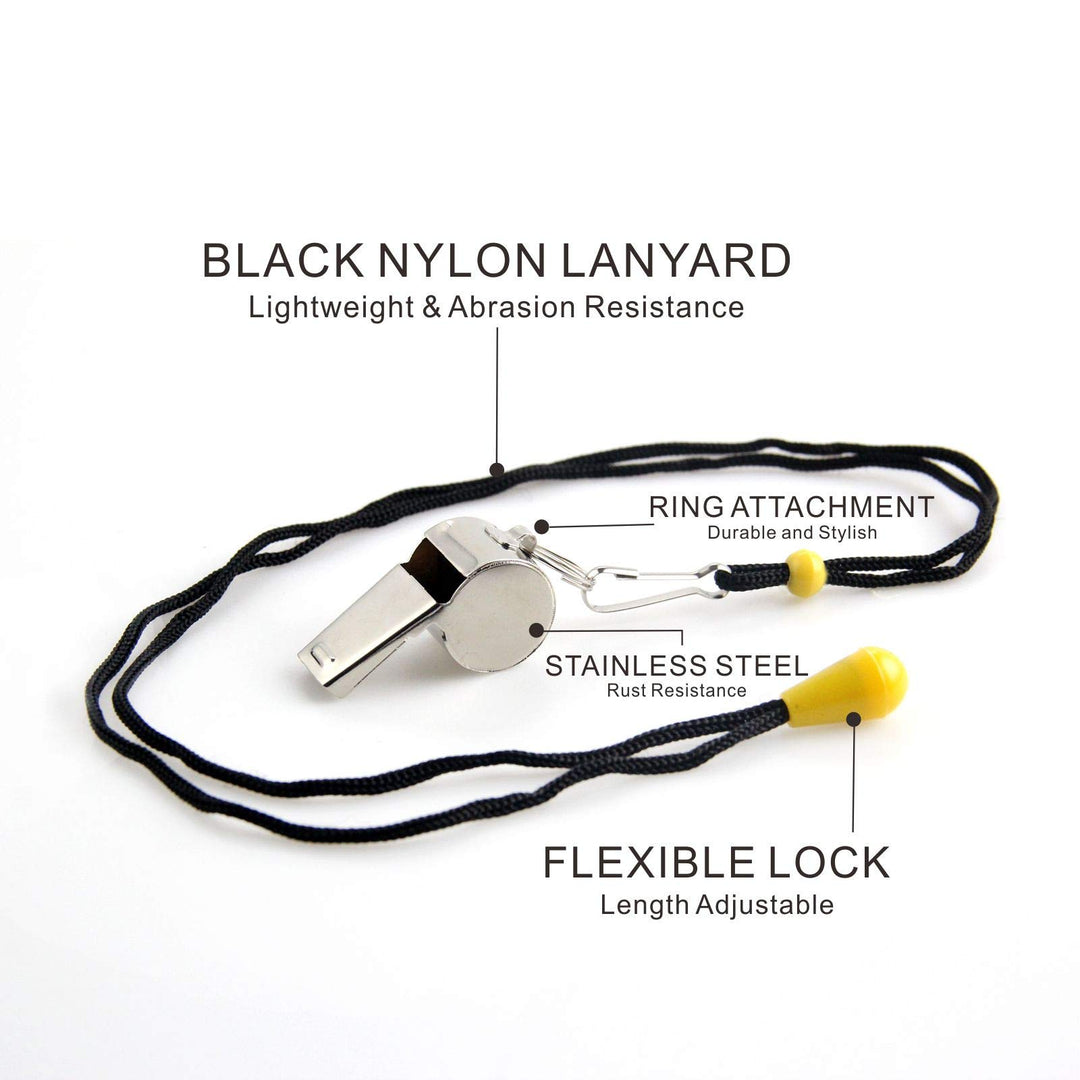 - Whistle with Lanyard: 19 black string designed to hang around neck or wear it on the wrist. You can adjust the yellow bead until the right length is reached