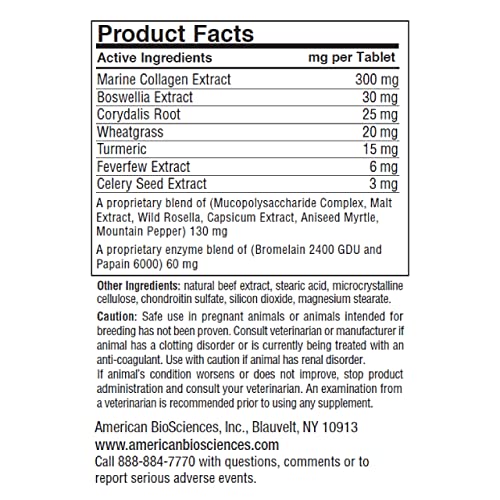 | ingredients | Active Ingredients: Marine Collagen Extract; Boswellia Extract; Corydalis Root; Wheatgrass; Turmeric; Feverfew Extract; Celery Seed Extract; A proprietary blend of (Mucopolysaccharide C complex, Malt Extract, Wild Rosella, Capsicum Extract, Aniseed Myrtle, Mountain Pepper); A proprietary enzyme blend of (Bromelain and Papain); Other Ingredients: natural beef extract, stearic acid, microcrystalline cellulose, chondroitin sulfate, silicon dioxide, magnesium stearate. |