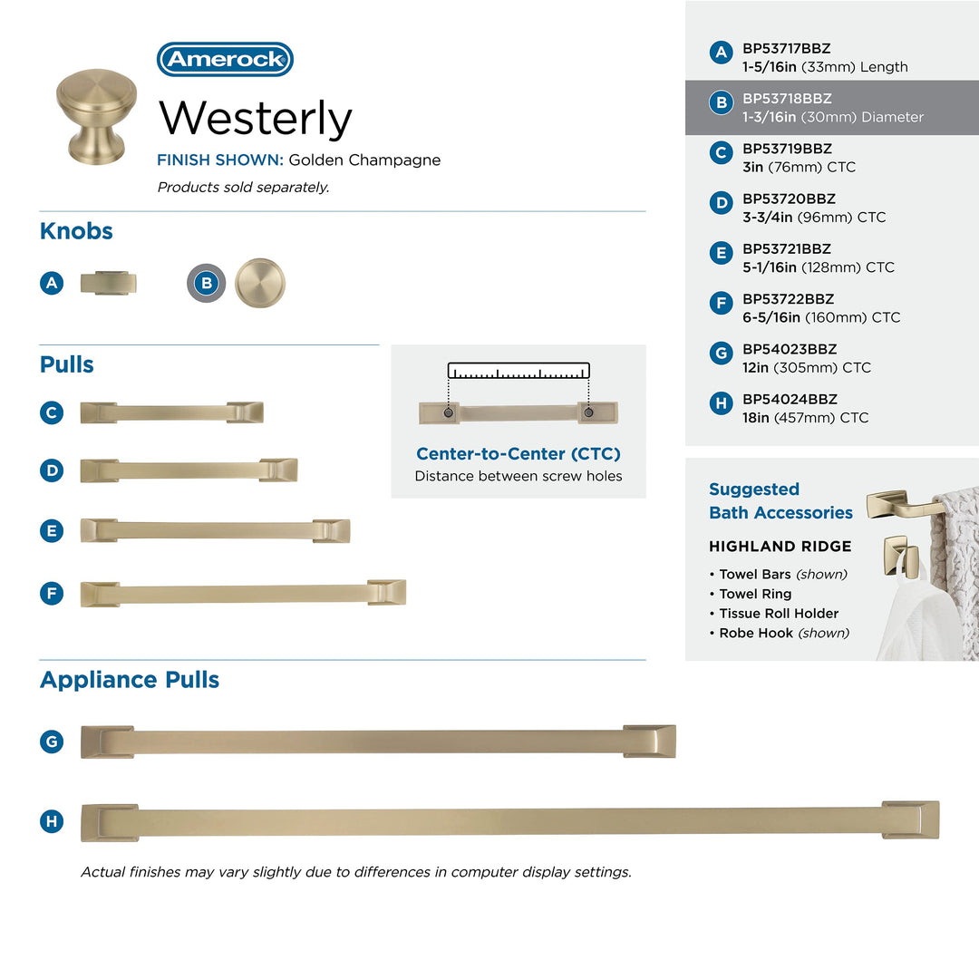 Discover the authentic , Cabinet Knob, Golden Champagne, 1-3/16 inch (30 mm) Diameter, Westerly, 1 Pack, Drawer Knob, Cabinet Hardware by Amerock, part of our Knobs collection. Imported directly from the USA and sourced from trusted suppliers, this product is 100% authentic and delivered anywhere in India at the best price.