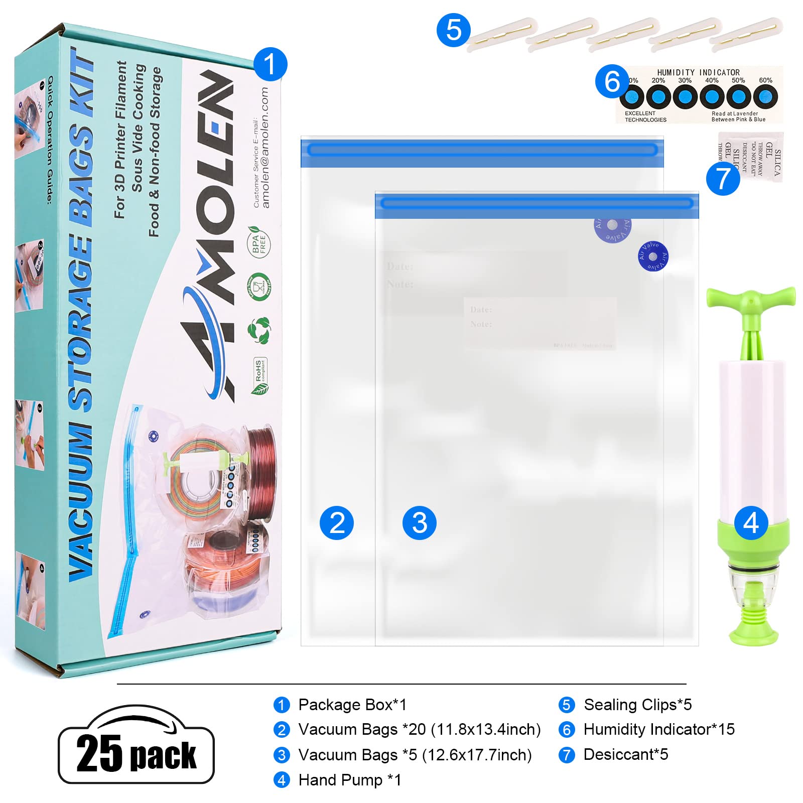 - Original Categories – Filament Storage Bag Vacuum Kit with Two Sizes - 51 PCS Cleaning Drying Sealed 25 Bags for 3D Printer Filament with Desiccants/Humidity Indicator Cards/Clips/Hand Pump by AMOLEN