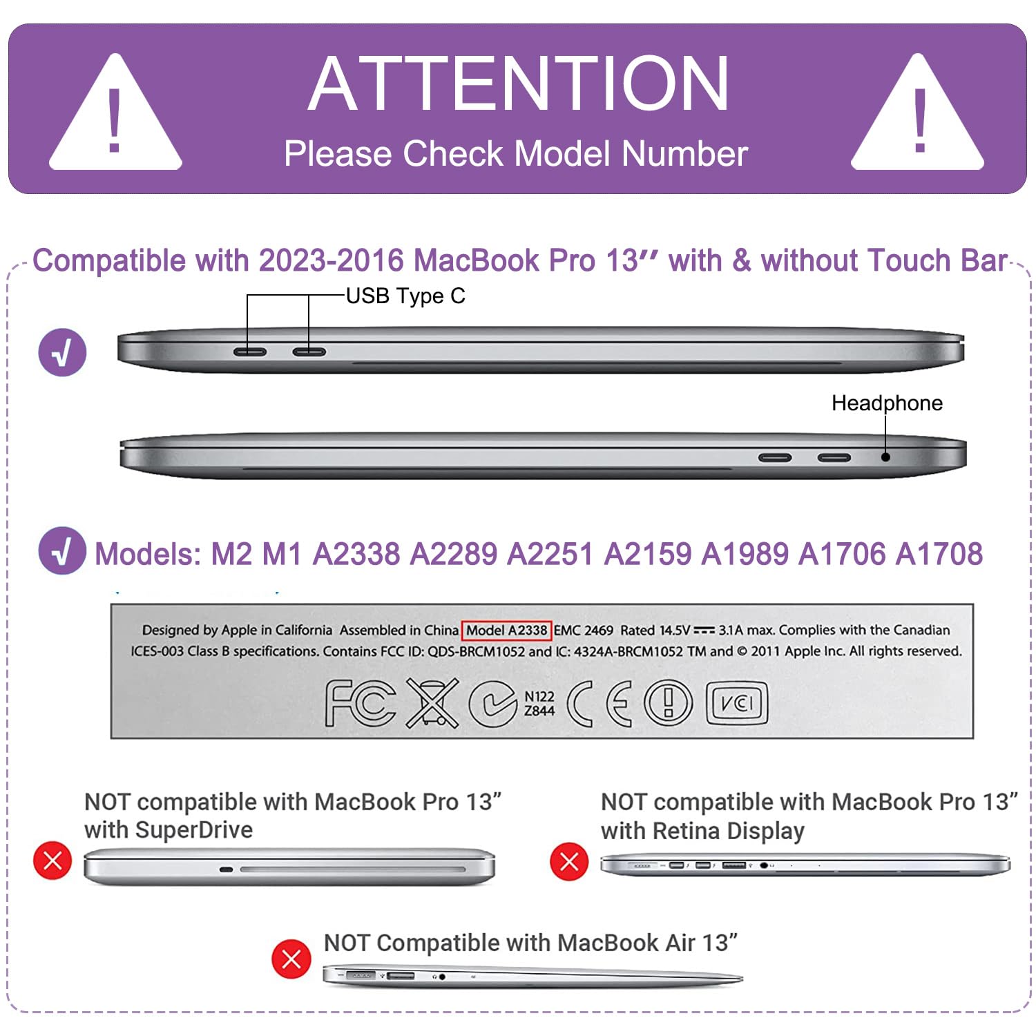 - Compatibility: Anban case only compatible MacBook Pro 13 inch 2024 2023 2022 2021 2020 2019 2018 2017 2016 Release with/without Touch Bar, Touch ID, Retina Display (Models: M2 M1 A2338 A2251 A2289 A2159 A1989 A1706 A1708). Please kindly check the model number A1xxx on the back of the Laptop before your purchase