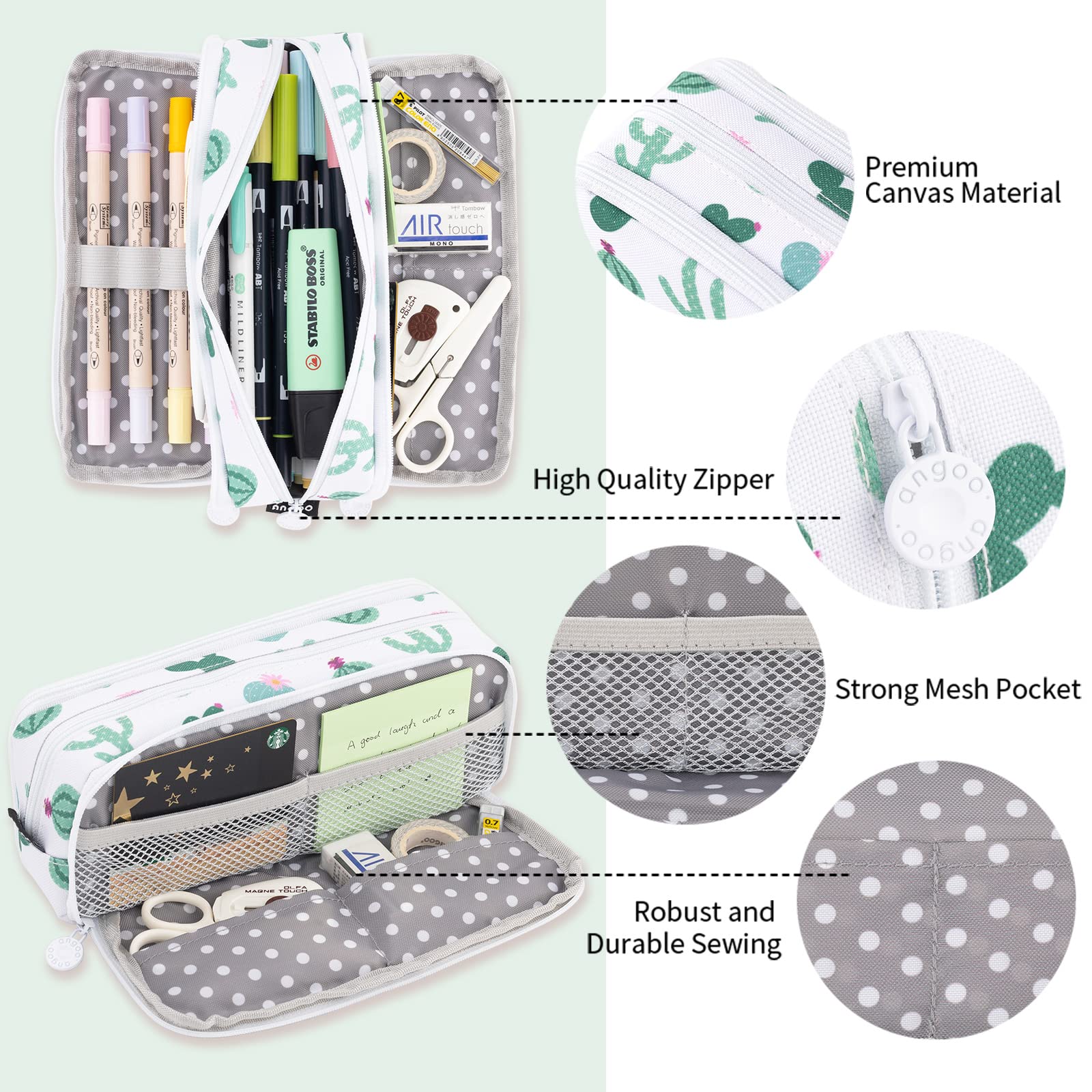 - Original Pen, Pencil & Marker Cases – Large Pencil Case Big Capacity 3 Compartments Canvas Pencil Pouch for Teen Boys Girls School Students (Green Cactus) by ANGOOBABY
