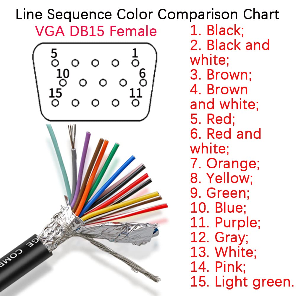 - VGA DB15 line sequence color comparison table: 1. Black; 2. Black and white; 3. Brown; 4. Brown and white; 5. Red; 6. Red and white; 7. Orange; 8. Yellow; 9. Green; 10. Blue; 11. Purple; 12. Gray; 13. White; 14. Pink; 15. Light green.