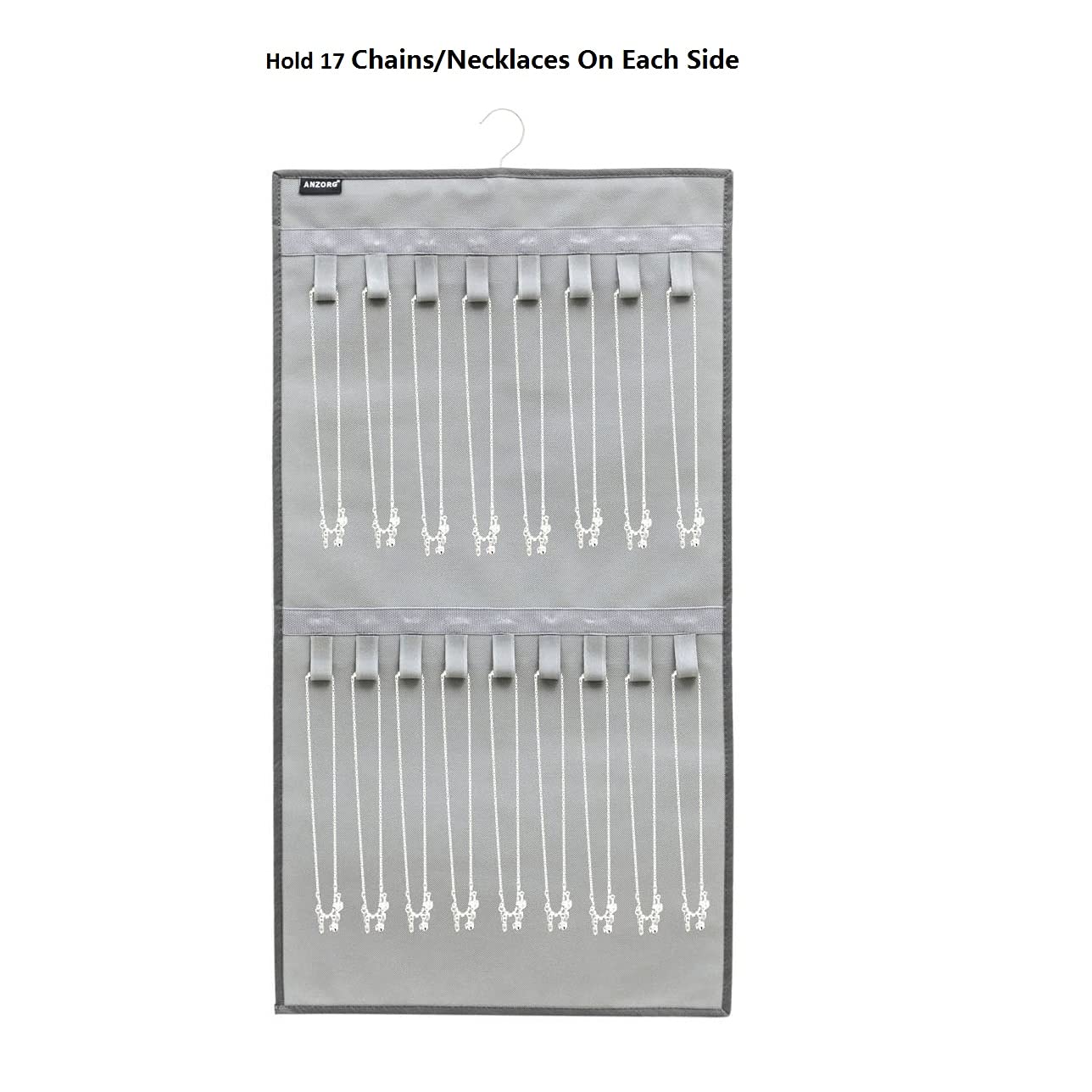 - Dual-sided necklace organizer with 17 hook loops on each side, total 34 strips. Necklace holder organizer with hook loops for hanging necklaces and long chains to avoid tangling. Make it easy to glance and pick the items quickly before wearing.
