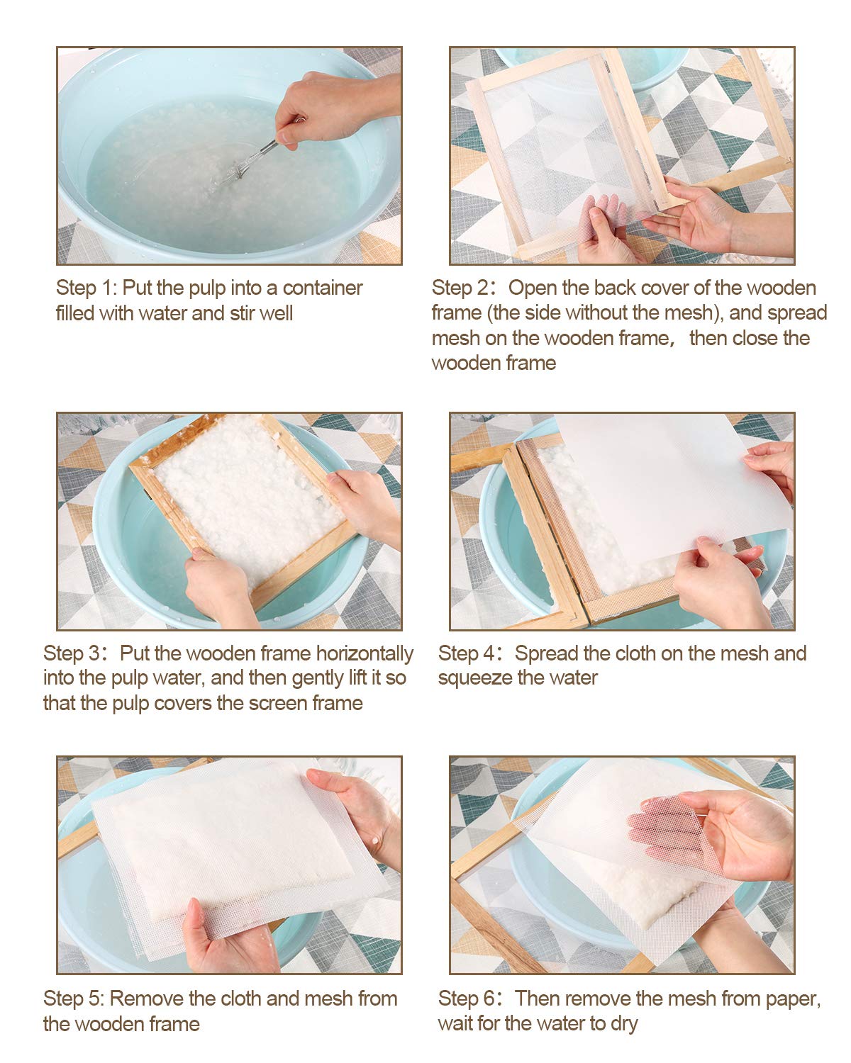 - How to Use: Use with original wood or cotton pulp material or non glossy recycled paper,in the process of making paper, you can decorate paper with dried flowers, flat leaves, inks, acrylic paints or colored recycled paper. When you finished the paper making, please clean the wooden frame and mesh, and put it to dry location