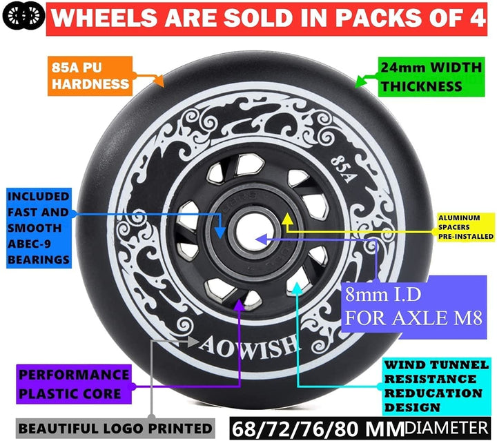 - Original Wheels – 4-Pack Inline Skate Wheels Outdoor Asphalt Formula 85A Hockey Roller Blades Replacement Wheel with Bearings ABEC-9 and Floating Spacers (Black, 76mm) by AOWISH
