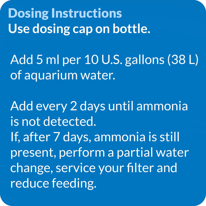 | directions | Use dosing cap bottle. Add 5 ml per 10 gallons (38 L) of aquarium water. Add every 2 days until ammonia is not detected. If, after 7 days, ammonia is still present, perform a partial water change, service your filter, and reduce feeding. Tip: AMMO LOCK does not remove ammonia; it converts it to a non-toxic form; so, even though ammonia is in a safe, non-toxic form, aquarium will still test positive for ammonia until it is removed by the biological filter. |
