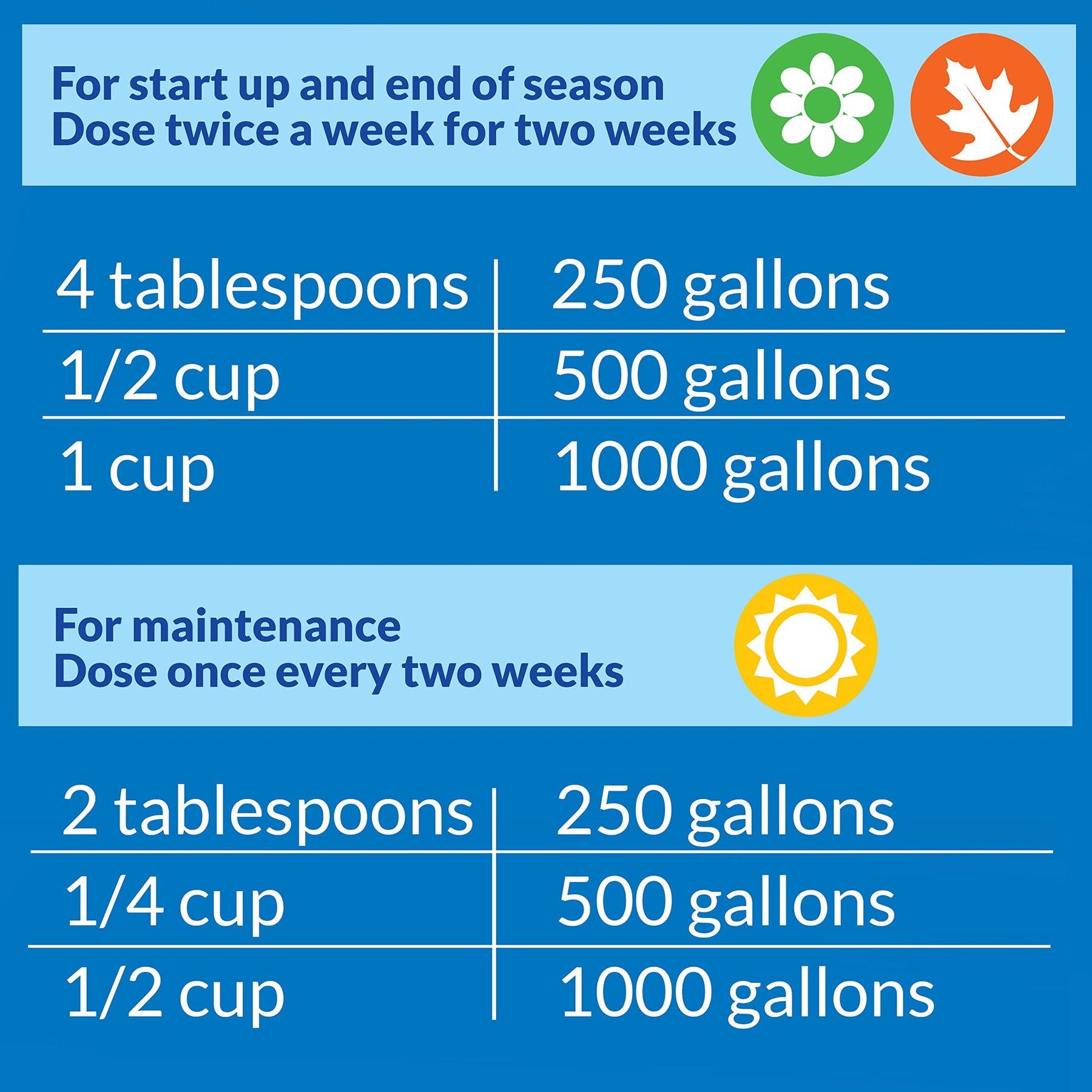 | directions | Shake well. Use dosing cap on bottle. Initial dose at spring start-up, and end of season, is 60 ml (4 Tbsp.) per 250 U.S. gallons (946 L) of pond water twice a week for 2 weeks. As a maintenance dose, add 30 ml (2 Tbsp.) per 250 U.S. gallons (946 L) of pond water every 2 weeks. |