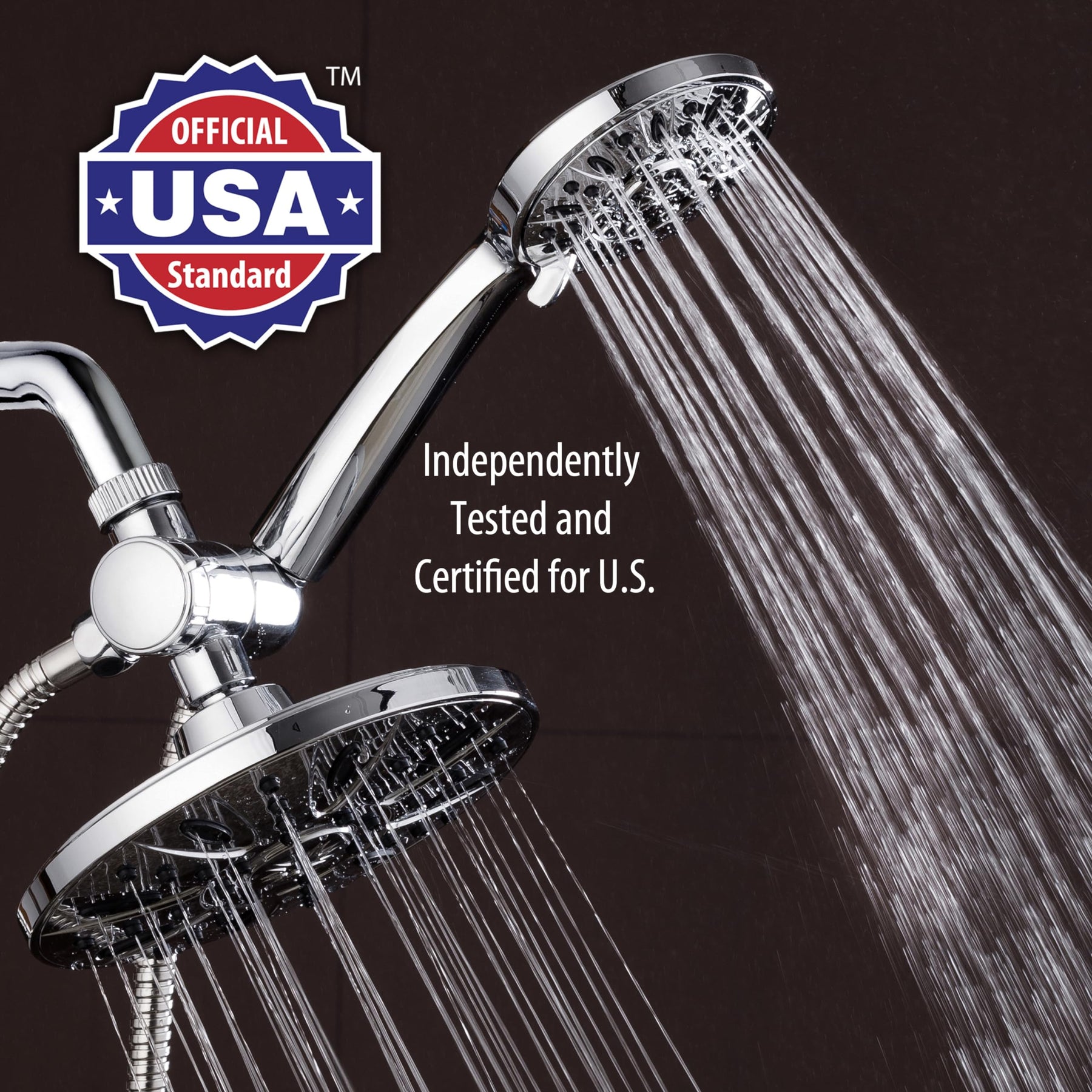 - 6-SETTING HAND SHOWER WITH: Power Rain, Pulsating Massage, Power Mist, Rain Massage, Rain Mist, Water Saving Pause mode | PATENTED 3-WAY WATER DIVERTER: Simply turn switch to direct water flow between two showers. Anti-Swivel Position Lock Nut for easy and secure connection | ANGLE-ADJUSTABLE OVERHEAD BRACKET: Lets you point each shower where you want it for hands-free operation at desired angle | EXTRA-FLEXIBLE 5 FT. STAINLESS STEEL HOSE: Durable Heavy-duty design with Brass Connection Nuts.