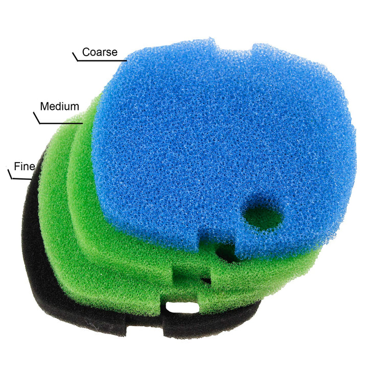 - 4 pcs of sponge bio filter pads (1xCoarse, 2xMedium, 1xFine): trap most visible debris particles without restricting water flow (Reusable after rinsed)